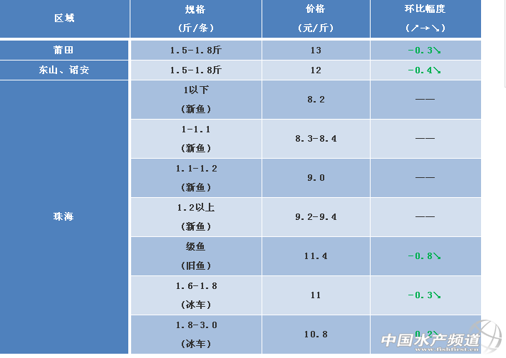 文/ 粵海飼料集團(tuán)、中國(guó)水產(chǎn)頻道 彭曉君 中國(guó)水產(chǎn)頻道原創(chuàng)報(bào)道,2018年9月8日海鱸塘頭價(jià)行情簡(jiǎn)析: 福建莆田、東山、詔安區(qū)域:新鱸魚規(guī)格在5-7兩,8兩以上鱸魚占養(yǎng)殖魚近一成,新鱸魚開始少量出魚,老鱸魚存塘量減少。受新鱸魚上市影響,本周魚價(jià)同比上周下跌0.3-0.4元/斤。 廣東珠海區(qū)域:(1)新魚規(guī)格沖量,1.1斤的規(guī)格對(duì)舊魚的沖擊大,導(dǎo)致舊魚的價(jià)格下滑;(2)大量新魚上市,養(yǎng)殖戶出魚心切,排隊(duì)安排出魚,目前出魚養(yǎng)戶基本以魚中自己養(yǎng)殖的魚為主,非魚中養(yǎng)殖戶出魚還是比較艱難;(3)目前8元多點(diǎn)魚,價(jià)格相對(duì)便宜,與去年同期價(jià)格反升,而今年價(jià)格一直下滑,冰庫(kù)開始入庫(kù)。 ※上述報(bào)價(jià)可能會(huì)因區(qū)域、規(guī)格、品質(zhì)和時(shí)間等因素的不同而會(huì)產(chǎn)生差異,在此僅供參考。環(huán)比幅度以本周價(jià)格與上周價(jià)格數(shù)據(jù)做對(duì)比。 【關(guān)鍵字】:海鱸 海鱸塘頭價(jià) 水產(chǎn)養(yǎng)殖 |