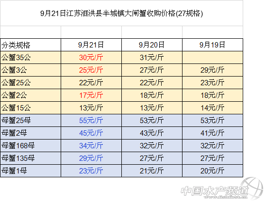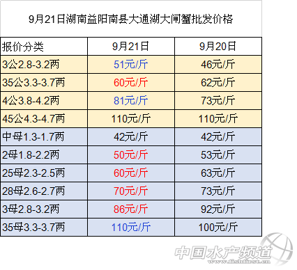 中國水產(chǎn)頻道整理報道,2018年9月21日江蘇常州凌家塘水產(chǎn)市場大閘蟹批發(fā)價格明顯上漲,最高上漲23元/斤。江蘇無錫蘇南水產(chǎn)城公蟹價格小幅下跌,母蟹價格保持不變。江蘇泗洪縣半城鎮(zhèn)大閘蟹收購價格漲跌不一。長沙馬王堆水產(chǎn)市場大閘蟹批發(fā)價小幅上漲。湖南益陽南縣大通湖大閘蟹批發(fā)價格漲跌不一。具體如下: 今日江蘇常州凌家塘水產(chǎn)市場大閘蟹批發(fā)價格明顯上漲,最高上漲23元/斤。做昨日相比: 公蟹:2公和25公的價格保持不變,3公、35公、4公的價格分別上漲1元/斤、6元/斤、21元/斤; 母蟹:母蟹的價格均上漲:18母和2母的價格分別上漲1元/斤和6元/斤,25母的價格上漲10元/斤,28母的價格23元/斤,3母的價格上漲22元/斤。 今日江蘇無錫蘇南水產(chǎn)城河蟹批發(fā)價格:于昨日相比,公蟹價格小幅下跌,母蟹價格保持不變:其中 公蟹:2公價格漲保持不變,22元/斤、25公和3公的價格下跌1元/斤、35公、4公和45公的價格個均下跌2元/斤 。 母蟹:保持不變 今日江蘇泗洪縣半城鎮(zhèn)大閘蟹收購價格漲跌不一 :與昨日相比, 公蟹:3.5公和2公的價格小幅下跌,均下跌1元/斤,3公的價格下跌2元/斤,25公和15公價格保持不變。 母蟹:25母、2母、168母、135母、1母價格均上漲,均上漲2元/斤。 今日長沙馬王堆水產(chǎn)市場大閘蟹批發(fā)價小幅上漲: 與昨日相比,168母蟹、2母蟹、25母蟹和28母蟹價格分別上漲2元/斤、2元/斤、1元/斤、2元/斤,3母價格為72元/斤。 今日湖南益陽南縣大通湖大閘蟹批發(fā)價格漲跌不一:于昨日相比: 公蟹:3公2.8-3.2兩的價格上漲5元/斤,35公3.3-3.7兩下跌2元/斤,4公3.8-4.2兩上漲8元/斤,45公4.3-4.7兩保持不變,110元/斤。 母蟹:中母1.3-1.7兩的價格保持不變,42元/斤,2母1.8-2.2兩、25母2.3-2.5兩、28母2.6-2.7兩的價格均下跌3元/斤、3母2.8-3.2兩的價格下跌6元/斤,35母3.3-3.7兩的價格上漲10元/斤; 數(shù)據(jù)來源于中國水產(chǎn)養(yǎng)殖網(wǎng) |