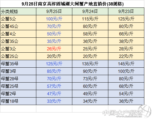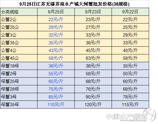 中國水產(chǎn)頻道整理報道,2018年9月25日南京高淳固城湖大閘蟹產(chǎn)地直銷價大部分價格下跌,最高下跌15元/斤。江蘇無錫蘇南水產(chǎn)城河蟹批發(fā)公蟹和母蟹價格均小幅下跌。江蘇常州凌家塘水產(chǎn)市場大閘蟹批發(fā)價格有漲有跌。江蘇泗洪縣半城鎮(zhèn)大閘蟹收購價格下跌。長沙馬王堆水產(chǎn)市場大閘蟹批發(fā)母蟹價格均小幅下跌。具體如下: 今日南京高淳固城湖大閘蟹產(chǎn)地直銷價大部分價格下跌:與昨日相比: 公蟹:5公、45公、4公、35公價格下跌,分別下跌15元/斤、10元/斤、8元/斤、1元/斤,3公的價格上漲了1元/斤,25公的價格保持不變; 母蟹:價格均下跌,35母、3母、28母、25母、2母和18母的價格分別下跌10元/斤、5元/斤、3元/斤、3元/斤、2元/斤和1元/斤 今日江蘇無錫蘇南水產(chǎn)城河蟹批發(fā)價格:與昨日相比,公蟹和母蟹價格均小幅下跌:其中, 公蟹:2公、25公和3公的價格均下跌1元/斤、35公的價格下跌3元/斤、4公的價格下跌2元/斤,45公的價格下跌5元/斤 。 母蟹:18母的價格下跌2元/斤,2母和25母的價格均下跌3元/斤、28母的價格下跌1元/斤、3母的價格下跌5元/斤、35母的價格下跌10元/斤。 今日江蘇常州凌家塘水產(chǎn)市場大閘蟹批發(fā)價格有漲有跌:做昨日相比: 公蟹:2公和25公、3公的價格上漲,分別上漲4元/斤、2元/斤和9元/斤,4公的價格分別下跌10元/斤; 母蟹:母蟹的價格均下跌:18母和2母的價格分別下跌3元/斤和5元/斤,25母的價格下跌7元/斤,3母的價格下跌25元/斤。 今日江蘇泗洪縣半城鎮(zhèn)大閘蟹收購價格下跌 :與昨日相比, 公蟹:3.5公和2公的價格小幅下跌,均下跌3元/斤,3公和15公的價格均下跌4元/斤,25公的價格價格下跌2元/斤。 母蟹:25母的價格保持不變,2母、168母、135母、1母價格均下跌,分別下跌4元/斤、4元/斤、1元/斤、2元/斤。 今日長沙馬王堆水產(chǎn)市場大閘蟹批發(fā)價均小幅下跌:與昨日相比, 168母蟹、2母蟹、25母蟹和28母蟹、3母的價格分別下跌10元/斤、5元/斤、6元/斤、16元/斤、18元/斤。 9月24日安徽當(dāng)涂塘南水產(chǎn)市場精品蟹收購價格漲跌不一:與23日相比: 公蟹:45公、4公的價格下跌,均下跌5元/斤,35公的價格保持不變,3公和2.5公的價格上漲,均上漲1元/斤; 母蟹:35母、25母和2母的價格均上漲,分別上漲10元/斤、2元/斤和2元/斤,28母的價格下跌了3元/斤,3母和15母的價格保持不變。 數(shù)據(jù)來源于中國水產(chǎn)養(yǎng)殖網(wǎng) |