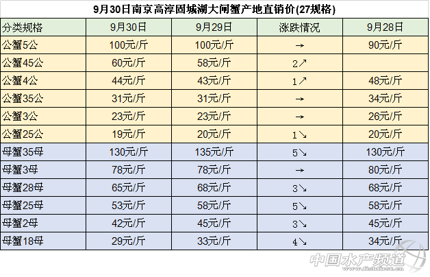 中國水產(chǎn)頻道整理報(bào)道,2018年9月30日南京高淳固城湖大閘蟹產(chǎn)地直銷價(jià)格漲跌不一,江蘇常州凌家塘水產(chǎn)市場大閘蟹批發(fā)價(jià)格漲跌不一,江蘇泗洪縣半城鎮(zhèn)大閘蟹收購價(jià)格穩(wěn)中有漲,安徽當(dāng)涂塘南水產(chǎn)市場河蟹收購價(jià)格穩(wěn)中有跌,湖南益陽南縣大通湖大閘蟹批發(fā)價(jià)格穩(wěn)中有漲,長沙馬王堆水產(chǎn)市場大閘蟹批發(fā)價(jià)價(jià)格有漲有跌,具體如下: 今日南京高淳固城湖大閘蟹產(chǎn)地直銷價(jià)格漲跌不一: 公蟹:5公的價(jià)格保持不變,45公的價(jià)格上漲2元/斤,4公的價(jià)格上漲1元/斤,35公和3公的價(jià)格保持不變,25公的價(jià)格下跌1元/斤。 母蟹:35母的價(jià)格下跌5元/斤,3母的價(jià)格保持不變、28母的價(jià)格下跌3元/斤,25母的價(jià)格下跌5元/斤,2母的價(jià)格下跌3元/斤,18母的價(jià)格下跌4元/斤。 今日江蘇常州凌家塘水產(chǎn)市場大閘蟹批發(fā)價(jià)格漲跌不一: 公蟹:2公、25公、3公、4公、45公價(jià)格均保持不變,35公的價(jià)格下跌1元/斤。 母蟹:18母的價(jià)格上漲3元/斤,2母和25母的價(jià)格均保持不變,28母的價(jià)格上漲6元/斤,3母的價(jià)格均上漲8元/斤,35母的價(jià)格上漲10元/斤,價(jià)格為110元/斤。 今日江蘇泗洪縣半城鎮(zhèn)大閘蟹收購價(jià)格穩(wěn)中有漲: 公蟹:35公和3公的價(jià)格均上漲1元/斤,25公的價(jià)格保持不變,2公和15公的價(jià)格均下跌1元/斤。 母蟹:2母的價(jià)格上漲3元/斤,168母的價(jià)格上漲2元/斤、135母的價(jià)格保持不變,1母的價(jià)格上漲1元/斤。 今日安徽當(dāng)涂塘南水產(chǎn)市場河蟹收購價(jià)格穩(wěn)中有跌: 公蟹:5公的價(jià)格保持不變,45公的價(jià)格下跌2元/斤,4公的價(jià)格保持不變,35公的價(jià)格下跌1元/斤,3公的價(jià)格保持不變,25公的價(jià)格下跌2元/斤。 母蟹:35母的價(jià)格保持不變,3母、28母、25母和2母的價(jià)格均保持不變,15母的價(jià)格下跌2元/斤。 今日湖南益陽南縣大通湖大閘蟹批發(fā)價(jià)格穩(wěn)中有漲 : 公蟹:3公、35公、4公和45公的價(jià)格均保持不變。 母蟹:1.3-1.7兩母蟹和2母的價(jià)格上漲2元/斤,25母和28母的價(jià)格上漲3元 /斤,3母和35母的價(jià)格下跌保持不變。 今日長沙馬王堆水產(chǎn)市場大閘蟹批發(fā)價(jià)價(jià)格有漲有跌: 168母的價(jià)格下跌1元/斤,2母、25母和28母的價(jià)格下跌2元/斤,3母的價(jià)格上漲1元/斤。 數(shù)據(jù)來源于中國水產(chǎn)養(yǎng)殖網(wǎng) |