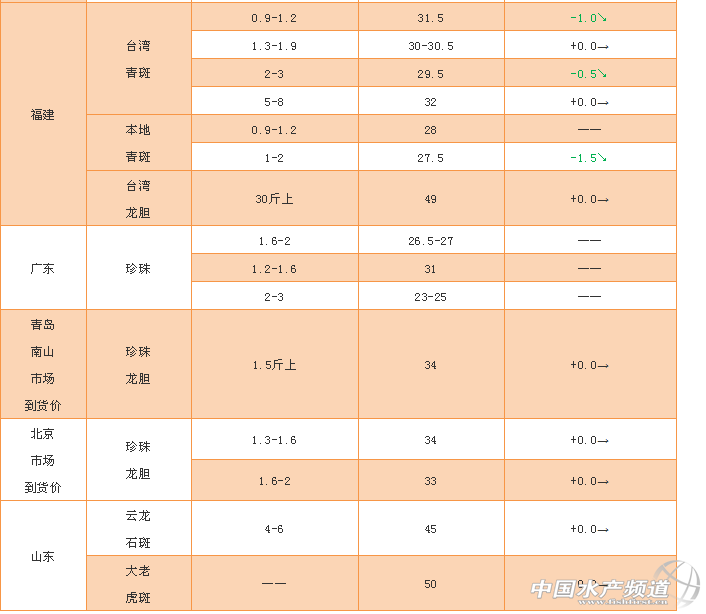 文/ 水產(chǎn)前沿 吳佳輝 石斑商品魚 海南:繼國慶節(jié)之后,市場消費量較低,許多養(yǎng)殖戶由于價格原因,出魚意愿不強,上市量也較少,價格與上周持平。 總體分析:今年海南紅東星斑的投苗量對比去年有較大程度提升,價格也穩(wěn)定在130元/斤左右。然而由于東星斑需要流水養(yǎng)殖,相比其他品種,對于環(huán)境的要求較為苛刻,且今年的病害問題較為嚴重,而市場需求量較高,總體來說價格比較穩(wěn)定。有養(yǎng)殖業(yè)者表示,如果成活率高,成本可維持在75元/斤左右,盈利空間較高。有業(yè)內(nèi)人士預計,如果能夠克服病害問題,紅東星斑將會有較好的發(fā)展。 石斑魚苗 廣東:珍珠8公分左右的中苗價格有所上漲,每公分0.9——1元。白苗1.5元每尾。湛江,粵西區(qū)有部分白苗上市。 斑石鯛·泥猛 特別感謝:海南晨海水產(chǎn)有限公司、海南大順發(fā)水產(chǎn)有限公司、萊州明波水產(chǎn)有限公司、廣東上上生物科技有限公司為本文提供價格! |