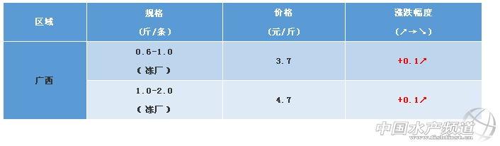 文/ 水產(chǎn)前沿 何鴻浩 中國水產(chǎn)頻道原創(chuàng)報(bào)道, 羅非魚 廣西區(qū)域:目前在養(yǎng)羅非魚新魚基本已達(dá)上市規(guī)格,天氣漸冷,養(yǎng)戶抓緊出魚,魚價(jià)較為穩(wěn)定。市場價(jià)方面:鮮活1.3斤上的4.8元/斤(平)。 粵西、海南:羅非魚市場達(dá)斤規(guī)格魚少,羅非魚4到5兩為主,魚價(jià)沒有變化。茂名:3.6-4.6元;陽江地區(qū):3.45-4.45元;湛江:3.4元-4.5元;海南:3.2-4.5元。 ※上述報(bào)價(jià)可能會(huì)因區(qū)域、規(guī)格、品質(zhì)和時(shí)間等因素的不同而會(huì)產(chǎn)生差異,在此僅供參考。環(huán)比幅度以本周價(jià)格與上周價(jià)格數(shù)據(jù)做對比 |