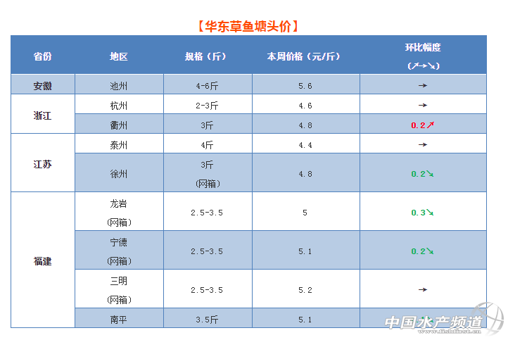 中國水產(chǎn)頻道原創(chuàng)報道,某位知名人士講過,其實水產(chǎn)業(yè)真正要強大不是某種魚與魚之間或魚與蝦之間的競爭,而是水產(chǎn)品與畜禽產(chǎn)品之間競爭,白肉與紅肉之間消費的競爭。豬肉禁售之下,草魚價格行情回暖的春天是不是要來呢? 文/圖 水產(chǎn)前沿 鄭鵬飛 一周要聞 1.這兩天很多人的朋友圈都被海大20周年刷爆了。海大集團用20年時間,從一個小作坊發(fā)展成為飼料年銷量達到1000萬噸,水產(chǎn)料超310萬噸的企業(yè)。海大的成長見證了中國水產(chǎn)的快速發(fā)展,同時也驚艷了整個養(yǎng)殖行業(yè)。 2.最近,上海再次出現(xiàn)非洲豬瘟。雖然有人預測,非洲豬瘟導致后期豬肉供不應求,但是近期的“禁調(diào)令”卻導致大批豬積壓賣不出,豬價行情持續(xù)下跌,均價已經(jīng)跌破13元/斤?梢哉f,今年養(yǎng)豬比養(yǎng)魚還要慘。不過,畜禽的這場風波也許會給水產(chǎn)一個難得的發(fā)展機會,魚價后期行情也值得期待。 今日行情 華南地區(qū) 本周華南地草魚整體仍然低迷,其中草魚苗種繼續(xù)有小幅下滑,成魚價格基本在4.2-4.5元/斤左右,部分市場仍爛市比較嚴重。好消息是,本周大草魚價格出現(xiàn)回暖,目前中山地區(qū)6斤以上大草魚價格較之前上漲了0.6元/斤。 中山:據(jù)流通商介紹,最近中山草魚苗種行情整體變化不大。由于成魚銷售緩慢,最近進苗的養(yǎng)殖戶也不多,價格仍有小幅下跌。目前大涌地區(qū)1-3兩的草魚最新塘頭價4.9元/斤,2-5兩的賣4.6元/斤,3-7兩的賣4.4元/斤。這幾天中山大草魚價格漲了點,6斤以上的最新塘頭賣6.6元/斤,較之前上漲0.6元。 開平:本周開平地區(qū)草魚仍然爛市。有養(yǎng)殖戶表示,魚車一般也就只裝1000斤左右,目前的行情養(yǎng)殖戶要虧死。 江門:目前江門地區(qū)草魚1-3兩的草魚苗種賣4.7元/斤,2-5兩的賣4.3元/斤,3-7兩的賣4元/斤。成魚價格一直不好,只賣到4.1-4.3元/斤,4斤以上的草魚賣5.7元/斤 肇慶:肇慶地區(qū)最新塘頭價4.3元/斤,價格繼續(xù)保持不變。養(yǎng)殖戶表示,價格肯定要漲,不過暫時還沒有希望,目前價格基本保持穩(wěn)定。 梅州:目前梅州地區(qū)草魚價格仍然維持在5元/斤左右,價格變化不大。據(jù)業(yè)內(nèi)人士介紹,最近魚能賣的動了,出魚量比之前好很多。本周汕尾及海豐地區(qū)草魚最新塘頭價4.2元/斤。 廣西:本周廣西地區(qū)草魚行情繼續(xù)低迷。目前貴港地區(qū)草魚價格有小幅下跌,最新塘頭價5元/斤,較之前下跌0.2元左右。目前桂林地區(qū)3斤的草魚最新塘頭價5元/斤,養(yǎng)殖戶表示行情變化不大,預計近期難有上漲,漲價可能要等到農(nóng)歷12月左右。在問到目前草魚行情時,防城港養(yǎng)殖戶表示目前天氣陰沉,不知道太陽還會不會再出現(xiàn)。 華中地區(qū) 本周華中地區(qū)草魚價格有地方漲,有地方繼續(xù)跌。其中,武漢地區(qū)本周草魚價格呈上漲趨勢,最新市場價已經(jīng)突破5.5元/斤,塘頭價也基本賣到5元/斤。湖南和江西大部分地區(qū)仍然出現(xiàn)小幅下滑,江西地區(qū)最新報價4.2-4.5元/斤,湖南益陽地區(qū)2斤的草魚賣4.2元/斤,常德地區(qū)最新報價4.5元/斤,近期仍有下滑趨勢。 江西:本周南昌地區(qū)草魚最新塘頭價4.4元/斤,2.5斤的草魚最低賣4.2元/斤,養(yǎng)殖戶對行情不看好。樟樹地區(qū)目前小規(guī)格草魚賣4.2元/斤,大一點的賣4.5元/斤。九江地區(qū)2-3斤的草魚最新塘頭價4.2元/斤。吉安地區(qū)目前塘頭價5元/斤,但是不太好賣。 湖南:本周湖南的魚價還是低的很。其中,岳陽地區(qū)最新塘頭價4.8元/斤;常德地區(qū)價格還在往下滑,最新塘頭價4.5元/斤,養(yǎng)殖戶表示目前草魚價格漲不了,但是漲價是必然的;益陽地區(qū)2斤多的4.3元/斤,3斤多的賣4.7-4.8元/斤,永州地區(qū)價格持續(xù)低迷。 湖北:本周武漢地區(qū)草魚價格有所上揚,目前市場價最高已經(jīng)突破5.5元/斤,塘頭價基本賣到5元/斤。隨州地區(qū)草魚最新塘頭價4.8元/斤,較上周下滑0.2元。 河南:目前河南鄭州地區(qū)草魚最新塘頭價4.5元/斤做魚,價格下跌比較明顯。 華東地區(qū) 本周華東地區(qū)草魚行情仍然比價低迷,大部分地區(qū)繼續(xù)有小幅下滑。其中,江蘇和山東地區(qū)草魚價格基本保持在4.5-5元/斤,江蘇鹽城有部分地區(qū)價格出現(xiàn)回暖;福建地區(qū)整體出現(xiàn)0.1-0.3元/斤的下滑,龍巖地區(qū)抬網(wǎng)最低價賣4.7元/斤;浙江部分地區(qū)出現(xiàn)小幅回暖,但是銷量暫時變化不大。 江蘇:據(jù)養(yǎng)殖戶反映,最近鹽城的草魚行情已經(jīng)有點回升了。目前徐州地區(qū)4-5斤的草魚最新塘頭價賣4.8元/斤,岡中地區(qū)最新塘頭價4.5元/斤。養(yǎng)殖戶表示,最近江蘇和山東的草魚大多都是賣4塊多,價高一點都沒人要,估計近期漲價有點難。 福建:本周福建地區(qū)草魚價格基本維持穩(wěn)定。其中,三明地區(qū)最新塘頭價5.2元/斤,龍巖地區(qū)網(wǎng)箱草魚賣5元/斤,吊網(wǎng)的賣4.7元/斤,閩江地區(qū)最新塘頭價5.2元/斤,養(yǎng)殖戶表示近期還是不會漲,南平地區(qū)最新塘頭價5.1元/斤。 浙江:衢州地區(qū)最近塘頭抬網(wǎng)價格4.8元/斤,目前銷量不大。養(yǎng)殖戶表示,現(xiàn)在大家基本都是高密度模式養(yǎng)殖,全國各地草魚存塘量大,估計一時半會沒有好的行情。 其他地區(qū) 四川:本周四川地區(qū)草魚