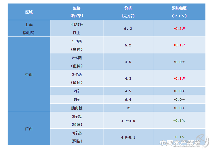 中國(guó)水產(chǎn)頻道原創(chuàng)報(bào)道, 文/ 水產(chǎn)前沿 植銀素 草魚 上海區(qū)域:近期草魚價(jià)格繼續(xù)低位震蕩,行情略高0.2元/斤,但只是低位波動(dòng),預(yù)計(jì)后期大草魚價(jià)格穩(wěn)定,保持目前較低狀態(tài)。 中山區(qū)域:魚種價(jià)格略有回升,超市草魚近期市場(chǎng)價(jià)格持,5斤以上價(jià)格持平,脆肉新魚上市,價(jià)格堅(jiān)挺。 廣西區(qū)域:近期草魚大規(guī)格魚存塘減少,廣東等外省商客減少來收魚,草魚有走不動(dòng)的跡象,價(jià)格近期比較低迷。 |