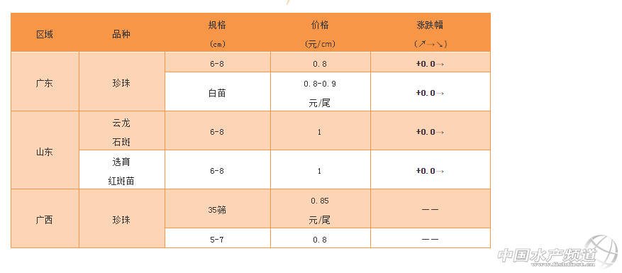 北方:本周珍珠龍膽的價(jià)格對(duì)比上周基本保持穩(wěn)定。北京到貨價(jià)格雖然報(bào)價(jià)33,但實(shí)際是以從海南到北京等地的價(jià)格算,從福建到北京的到貨價(jià)實(shí)際只有32元,本周的價(jià)格也報(bào)價(jià)32元/斤。 石斑魚(yú)苗 特別感謝:海南晨海水產(chǎn)有限公司、海南大順發(fā)水產(chǎn)有限公司、萊州明波水產(chǎn)有限公司、廣東上上生物科技有限公司、廣東大順發(fā)水產(chǎn)有限公司為本文提供價(jià)格! |