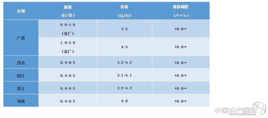 文/圖 水產(chǎn)前沿 植銀素 中國水產(chǎn)頻道原創(chuàng)報(bào)道,廣西區(qū)域:目前在養(yǎng)羅非魚新魚基本已達(dá)上市規(guī)格,天氣漸冷,養(yǎng)戶抓緊出魚,出魚量較為集中,本周魚價(jià)魚上周持平。市場價(jià)方面:鮮活1.3斤上的4.8元/斤(平)。 粵西、海南:羅非魚市場因工廠訂單減少,進(jìn)入冬季羅非清塘出魚季,但大魚存塘不多,魚價(jià)相對維持穩(wěn)定。 ※上述報(bào)價(jià)可能會因區(qū)域、規(guī)格、品質(zhì)和時(shí)間等因素的不同而會產(chǎn)生差異,在此僅供參考。環(huán)比幅度以本周價(jià)格與上周價(jià)格數(shù)據(jù)做對比 【關(guān)鍵字】:羅非魚 羅非魚價(jià)格 水產(chǎn)養(yǎng)殖 |
