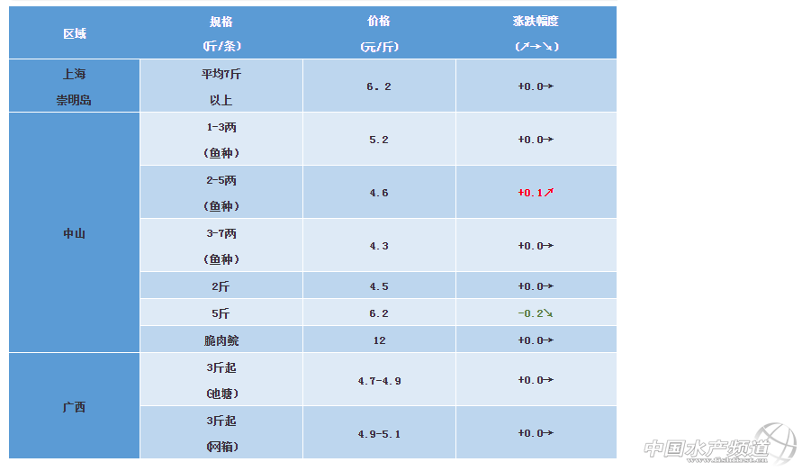 文/圖 水產(chǎn)前沿 植銀素 中國(guó)水產(chǎn)頻道原創(chuàng)報(bào)道,上海區(qū)域:近期草魚(yú)價(jià)格繼續(xù)低位震蕩,行情穩(wěn)定,但只是低位波動(dòng),預(yù)計(jì)后期大草魚(yú)價(jià)格穩(wěn)定,保持目前較低狀態(tài)。 中山區(qū)域:魚(yú)種價(jià)格略有回升,超市草魚(yú)近期市場(chǎng)價(jià)格持平,5斤以上價(jià)格下跌,脆肉新魚(yú)上市,價(jià)格堅(jiān)挺。 廣西區(qū)域:近期草魚(yú)大規(guī)格魚(yú)存塘減少,廣東等外省商客減少來(lái)收魚(yú),草魚(yú)有走不動(dòng)的跡象,價(jià)格近期比較低迷。 ※上述報(bào)價(jià)可能會(huì)因區(qū)域、規(guī)格、品質(zhì)和時(shí)間等因素的不同而會(huì)產(chǎn)生差異,在此僅供參考。環(huán)比幅度以本周價(jià)格與上周價(jià)格數(shù)據(jù)做對(duì)比 【關(guān)鍵字】:草魚(yú) 草魚(yú)價(jià)格 水產(chǎn)養(yǎng)殖 |
