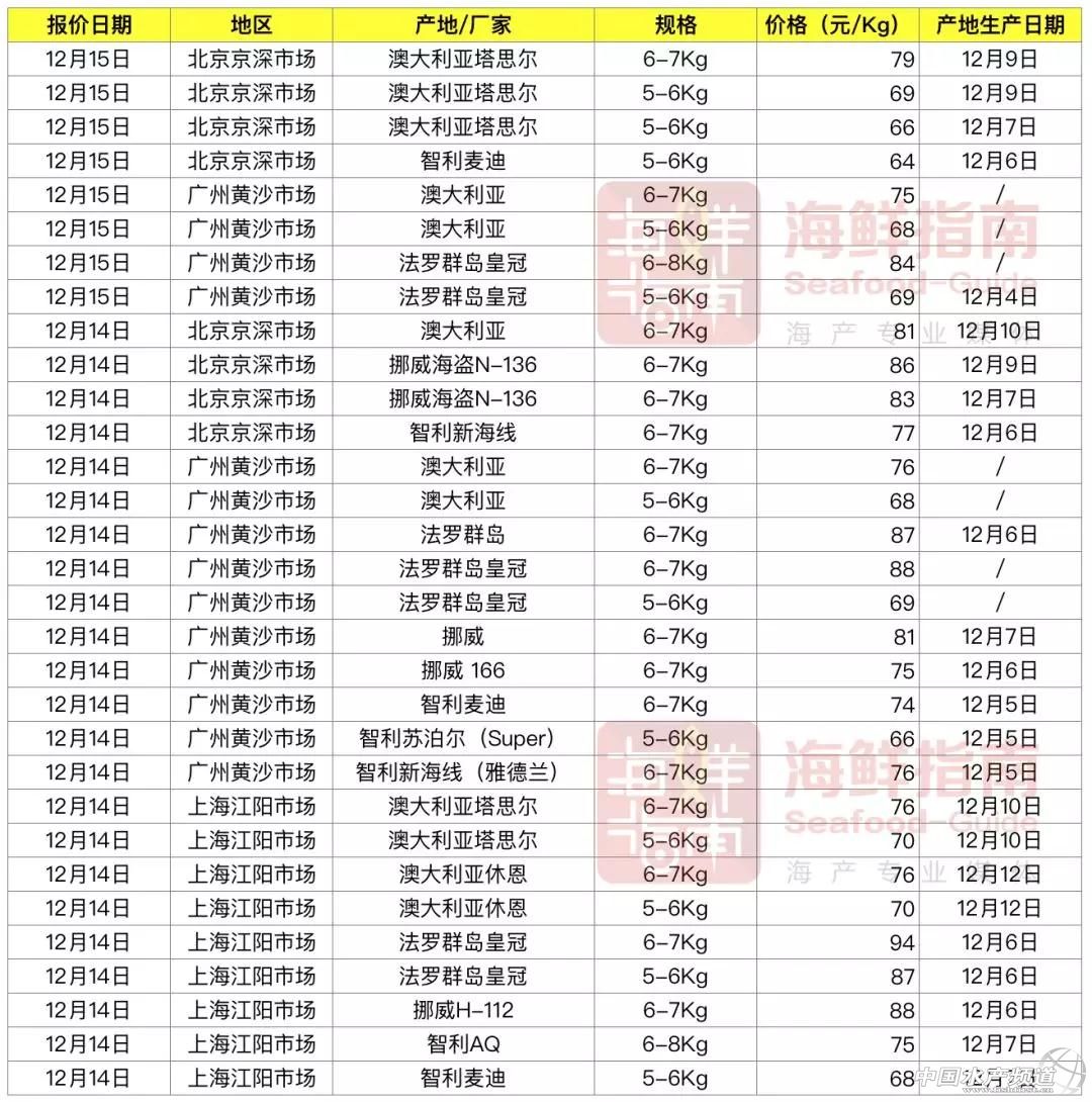 中國水產(chǎn)頻道原創(chuàng)報道, 海鮮指南將于每周推出三次全國最大批發(fā)市場冰鮮三文魚報價,敬請持續(xù)關(guān)注! 文/ 海鮮指南(seafood-guide)沈基文 上海冰鮮三文魚報價上漲,廣州挪威魚貨多價平 今天(12月15日)早上,北京:澳大利亞(9日)小魚報價69元/公斤、大魚79元/公斤;智利(6日)小魚64元/公斤; 今天(12月15日)早上,廣州:澳大利亞小魚68元/公斤、大魚75元/公斤,與12月13日報價持平;法羅小魚69元/公斤、大魚84元/公斤,與12月13日相比下降了1-2元/公斤;廣州市場挪威魚到貨量較多,部分經(jīng)銷商正采取特價銷售,挪威(6日)大魚75元/公斤,與12月12日挪威(8日)大魚報價下降了9元/公斤(此報價并不代表市場所有挪威三文魚價格,詳細價格請咨詢供應(yīng)商); 昨天(12月14日)晚間,上海:澳大利亞(12日)小魚70元/公斤、大魚76元/公斤,與12月12日相比上漲了1-2元/公斤;法羅群島(6日)小魚87元/公斤、大魚94元/公斤,與12月12日相比小魚上漲了7元/公斤、大魚下降了4元/公斤;挪威(6日)大魚88元/公斤,與12月12日相比上漲了2元/公斤;智利(7日)大魚75元/公斤,與12月12日相比上漲了2元/公斤。 聲明: 1、本文所提三文魚均指大西洋鮭; 2、報價均為進口商批發(fā)價,與零售/餐飲/酒店渠道報價不相等,請勿對號入座; 3、報價僅供參考,報價詳情咨詢請聯(lián)系本文作者(海鮮指南 編輯部 沈基文)18620796931 詳情請看下圖(12月14日-15日全國批發(fā)市場冰鮮三文魚報價): |