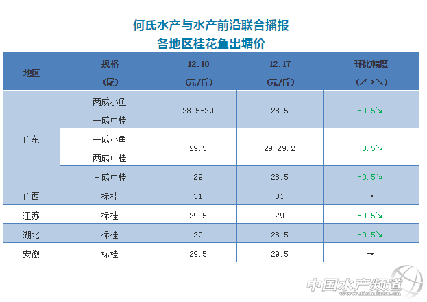 中國水產(chǎn)頻道原創(chuàng)報(bào)道, 文|圖 何氏水產(chǎn) 水產(chǎn)前沿 李靜 1、廣東桂魚價(jià)格與上周相比整體下跌了0.5元/斤,現(xiàn)在最好規(guī)格的魚(一成小魚、兩成中桂)價(jià)格最高訂到29.2元/斤,大部分成交價(jià)在28.5-29元/斤,主要看實(shí)際規(guī)格來定價(jià)。由于現(xiàn)在桂魚存塘量都以大規(guī)格為主,魚頭偏小的魚養(yǎng)戶都不愿意出,導(dǎo)致推出市場偏小魚不多,該種規(guī)格的魚市場比較缺。中桂存塘充足,能滿足市場需求。本周天氣回曖,預(yù)測價(jià)格可能還會(huì)小幅下跌,銷量會(huì)慢慢上升。