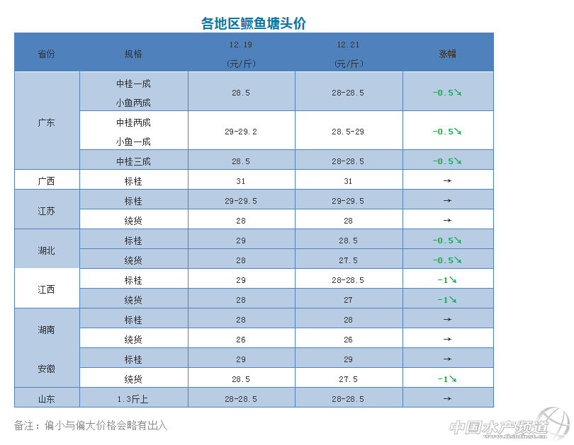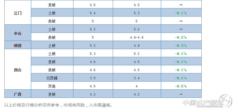 中國水產(chǎn)頻道原創(chuàng)報道, 鱖魚價格又跌了,到底啥時候會漲呢? 文/圖 水產(chǎn)前沿 李靜 今天,廣東鱖魚塘頭價格又跌了0.5元/斤左右,大部分以訂28.5元/斤的價格為主,個別規(guī)格好的訂29元/斤,打死包0.8-1.6斤規(guī)格收30元/斤,行情一片慘淡。 近兩周廣東鱖魚價格持續(xù)下滑,外省鱖魚受此影響價格也明顯回落。這兩天,湖北標(biāo)桂和統(tǒng)貨分別跌了0.5元/斤,江西標(biāo)桂和統(tǒng)貨分別跌了1元/斤,安徽統(tǒng)貨跌了1元/斤。其他地區(qū)鱖魚價格暫時變化不大。 這輪鱖魚價格持續(xù)下跌,讓不少人感到意外。有些之前訂魚現(xiàn)在抓魚的流通商虧本嚴(yán)重,不抓的話也要支付幾萬元的違約金,進(jìn)退兩難。預(yù)計本月底元旦節(jié)日臨近,行情好轉(zhuǎn)的話鱖魚價格有望回升。 這兩天,不少地區(qū)餌料魚價格再次大幅下跌。肇慶麥鯪暴跌0.3元/斤,泰鯪暴跌了0.4元/斤左右,巴西鯛也跌了0.1元/斤;高明麥鯪、土鯪、泰鯪、巴西鯛、蘇魚也分別跌了0.1-0.2元/斤左右;清遠(yuǎn)麥鯪也跌了0.1元/斤左右;中山泰鯪跌了0.2元/斤左右;順德土鯪跌了0.3元/斤左右;四會蘇魚暴跌0.5元/斤,土鯪、麥鯪、泰鯪、巴西鯛分別跌了0.1元/斤;其他地區(qū)的價格暫時保持穩(wěn)定。隨著年底不少餌料魚開始清塘,鱖魚攝食量減少,預(yù)計近期餌料魚價格有可能繼續(xù)下滑。 |