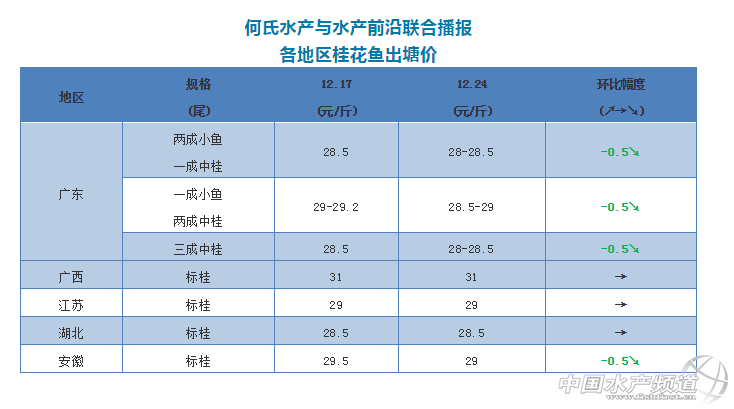 中國(guó)水產(chǎn)頻道原創(chuàng)報(bào)道, 文|圖 何氏水產(chǎn) 水產(chǎn)前沿 李靜 1、廣東桂魚價(jià)格與上周相比又跌了0.5元/斤,現(xiàn)在最好規(guī)格的魚(一成小魚、兩成中桂)價(jià)格最高訂到29元/斤,大部分成交價(jià)在28-28.5元/斤,主要看實(shí)際規(guī)格來(lái)定價(jià),F(xiàn)在大部分收購(gòu)商都在抓之前訂下來(lái)的魚,價(jià)格在29元/斤以上,基本都處于虧本狀態(tài)。凍庫(kù)價(jià)格也下跌了,0.8-1.6斤價(jià)格30元/斤,最好的規(guī)格跌幅達(dá)2元/斤,F(xiàn)在桂魚存塘和每天出魚都是以大規(guī)格為主,本周又有一波新的冷空氣到達(dá)廣東,周末上元旦的貨量,預(yù)測(cè)銷量會(huì)上升。