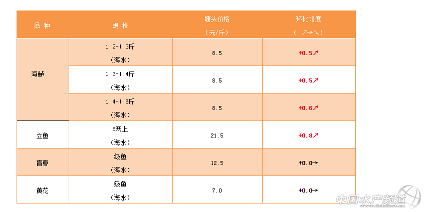 文/ 珠海海龍 水產(chǎn)前沿 吳佳輝 中國水產(chǎn)頻道原創(chuàng)報道,2019年1月11日海鱸、立魚、盲曹、黃花塘頭價格如下: 鱸魚:鱸魚級魚,中魚存塘少,需求量增大,價格上升較快,預(yù)計后市還會微漲。 立魚:目前行情較上星期有所回升,普遍出魚規(guī)格在4.5兩至5兩左右。 盲曹:統(tǒng)級11.5元/斤 黃花:市場需求少,流通小,預(yù)計后續(xù)波動不大。 欲了解更多關(guān)于海鱸價格行情的內(nèi)容請進:http://www.szsfz.cn/portal.php?mod=list&catid=57 |