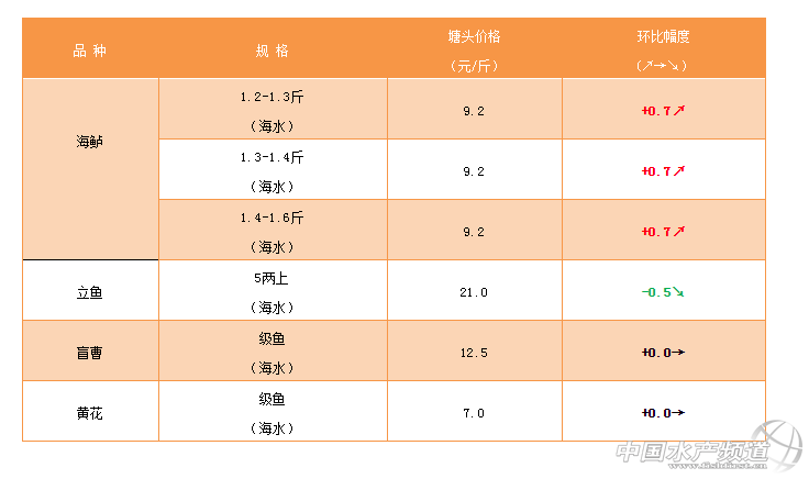文/ 珠海海龍 水產(chǎn)前沿 吳佳輝 中國水產(chǎn)頻道原創(chuàng)報道,2019年1月18日海鱸、立魚、盲曹、黃花塘頭價格如下: 鱸魚:1.6-1.9斤(冰車),9元/斤。鱸魚價格本周上漲較快,隨著中大魚存塘量增加,預期后面冰車價格會微跌。 立魚:行情穩(wěn)定。 盲曹:統(tǒng)級11.5元/斤 黃花:目前存塘少,受市場流通影響需求小,后期看漲。 欲了解更多關(guān)于海鱸價格行情的內(nèi)容請進:http://www.szsfz.cn/portal.php?mod=list&catid=57 |