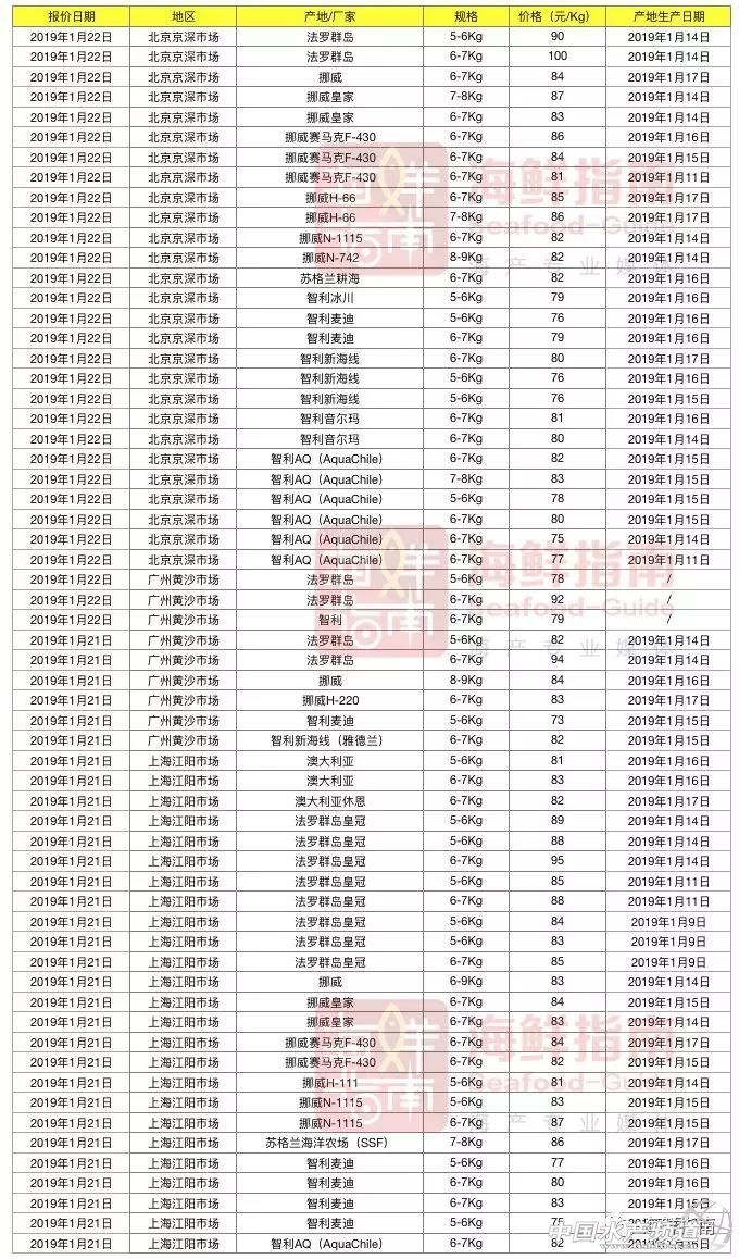 詳細報價見下圖(1月21-22日全國批發(fā)市場冰鮮三文魚報價):
