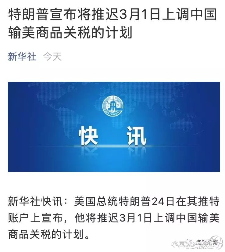 | 中國(guó)水產(chǎn)頻道綜合報(bào)道, 據(jù)新華社快訊:美國(guó)總統(tǒng)特朗普24日在其推特賬戶(hù)連發(fā)2條推文宣布,他將推遲3月1日上調(diào)中國(guó)輸美商品關(guān)稅的計(jì)劃。 期待貿(mào)易環(huán)境越來(lái)越好! |