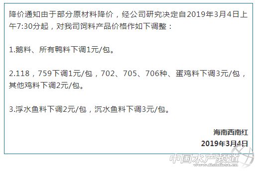 | 中國水產(chǎn)頻道綜合報道, 今天3月4日,又有廣西、海南飼料企業(yè)宣布降價。 進入2019年后,飼料市場降價風(fēng)暴頻繁襲擊,1月、2月、3月,各大飼料公司不停地下調(diào)價格,涉及大宗淡水魚料如草魚料、羅非魚料、叉尾料等;特種魚料如生魚料、加州鱸料、黃顙魚料、蛙料等;高檔蝦料如蝦苗料、斑節(jié)對蝦料、南美白蝦料等;海水魚料如黃鰭鯛(立魚)料、尖吻鱸料等。 盡管養(yǎng)殖戶表示,原料價格下降幅度很大,如豆粕降了1000多元一噸,但飼料價格只有幾元一包,降得少難達到其心理價位,但業(yè)內(nèi)人士表示,2019年飼料價格下降是近幾年比較異常的,尤其是淡水魚料在短時間(1-2天)內(nèi)密集下降了2次。 2月底掀起的降價潮一直到今天仍在持續(xù)。 2月28日,海大各大子公司率先下降常規(guī)魚料價格。3月1日,通威子公司馬上跟進宣布2日常規(guī)魚料降價,降價區(qū)域主要集中在珠三角地區(qū)。 3月2日海大、通威再同時宣布又一次下調(diào)常規(guī)淡水魚價格,同時降價還有蝦料和海水魚料,降價地區(qū)從珠三角延伸到福建。 3月3日,粵海、恒興等對蝦、海水魚優(yōu)勢品牌企業(yè)也紛紛下調(diào)價格,包括海大在內(nèi),海水魚料一噸降了300元,蝦料一噸最高降了800元。降價地區(qū)進一步擴展到粵東。 3月4日即今天,廣西、海南飼料企業(yè)加入降價行列,百洋產(chǎn)業(yè)投資集團股份有限公司飼料分公司下調(diào)了斑節(jié)對蝦、南美白對蝦、開口料,每噸下降300元。海南西南紅飼料公司下降羅非魚料價格,浮水料降2元/包,沉水料降3元/包。據(jù)海南羅非魚養(yǎng)殖戶稱,近來羅非魚價格下跌了,一周之內(nèi)下跌了2毛錢/斤,可能與美國延遲提高關(guān)稅有關(guān)。目前養(yǎng)殖戶們非常焦慮,所以祈盼飼料降價,經(jīng)銷商也提醒養(yǎng)殖戶暫停拉料。據(jù)悉,明天可能有更多的羅非魚料企業(yè)會調(diào)價。 關(guān)于這次飼料大降價,業(yè)內(nèi)分析主要原因還是三個: 1、原料價格大幅降價。中美經(jīng)濟貿(mào)易戰(zhàn)有所緩解,美國總統(tǒng)特朗普還延遲加收關(guān)稅時間,未來美國大豆有望增加進口中國。重要的是非洲豬瘟影響,養(yǎng)豬量大幅減少,豆粕需求直線下降。據(jù)飼料行業(yè)信息網(wǎng)顯示,2019年2月份國內(nèi)豆粕月度均價環(huán)比大幅下跌120元/噸,跌幅4.25%。預(yù)計,3月份豆粕行情仍將低位運行。今天主流豆粕報價為2450-2580元/噸,較昨天再跌20元/噸。魚粉處低價位:今天秘魯超級蒸汽蒸汽魚粉報價在10600-10800元/噸,議價在10400-10600元/噸。近期新季魚粉到港,我國主要港口魚粉庫存繼續(xù)呈上升趨勢中。 2、水產(chǎn)養(yǎng)殖品種價格幾近全線大幅跌。春天養(yǎng)殖投苗旺季即將到來,為增加養(yǎng)殖戶投苗信心,降低養(yǎng)殖成本。 3、出于飼料廠自身考慮。為爭取更多的市場份額,降價是較好的切入手段。 附:百洋產(chǎn)業(yè)投資集團股份有限公司飼料分公司調(diào)價通知 海南西南紅飼料調(diào)價通知 |