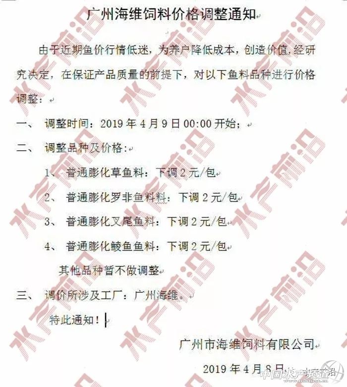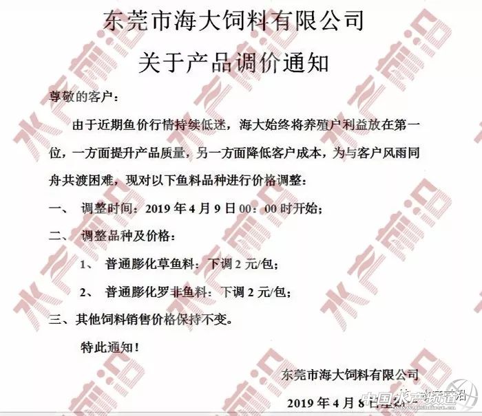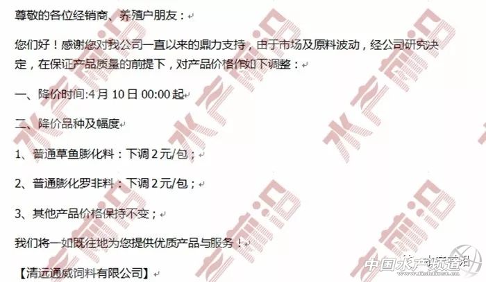 | 中國水產(chǎn)頻道原創(chuàng)報道, 就在昨天,水產(chǎn)料的第五輪降價正式打響,廣州海維、廣州大川、東莞海大、江門海大等多家海大分公司再次下調(diào)飼料價格,部分公司膨化料已累積降價達到480元/噸!驹斍橐姡大動作!飼料又降了,海大五輪累積降價480元一噸!飼料降價大戰(zhàn)遠沒有結(jié)束!】 廣州海維飼料價格調(diào)整通知 東莞海大飼料價格調(diào)整通知 江門海大魚料降價通知 廣州大川魚料價格調(diào)整通知 面對海大再次發(fā)起的降價,通威這次第一時間做出了回應。就在海大降價通知發(fā)出不久,廣東通威、高明通威、清遠通威等多家公司也是再次下調(diào)了部分品種的飼料價格。其中草魚和羅非膨化料再降2元/包,高明通威更是將顆粒料也下調(diào)2元/包,鯪魚和叉尾膨化料降40元/噸。 清遠通威價格調(diào)整通知 廣東通威價格調(diào)整通知 高明通威價格調(diào)整通知 據(jù)了解,截止目前通威和海大在很多品種上的降價幅度都是非常驚人。就在3月16日,通威特種料下調(diào)幅度就達到了300元/噸,3月18日珠海海壹也正式將蝦料價格降低300元/噸。而昨天海大在普通淡水膨化料方面的降價也相當于是對之前通威特種料和蝦料降價的進一步回應。 面對通威的這次快速跟進,有海大的分子公司負責人表示:還沒完,海大會就市場的最新情況隨時做出回應。海大和通威的這場價格戰(zhàn)不僅僅是營銷策略的競爭,同時也是薛華董事長的“利潤再分配戰(zhàn)略”和劉漢元董事長的“光伏反哺農(nóng)業(yè)戰(zhàn)略”在華南魚料市場的正面碰撞。從中我們可以看到兩大集團在水產(chǎn)市場一決高下的決心,如此激烈的碰撞不禁讓廣大養(yǎng)殖戶看了拍手稱快。無論這次價格戰(zhàn)誰贏誰輸,相信最后都會讓養(yǎng)殖戶成為最大的受益者。 |