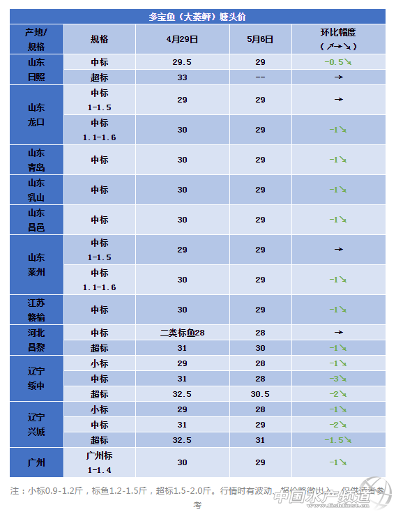 | 中國水產(chǎn)頻道原創(chuàng)報道, 業(yè)內(nèi)人士仍看好6月行情!五一過后,遼寧、山東多寶魚價格略微回落。養(yǎng)戶可以暫養(yǎng)以觀后市! 文 | 表 工業(yè)化水產(chǎn)圈 李帥、植銀素 一周要聞 近日,針對弧菌病研發(fā)的大菱鲆(俗稱多寶魚)鰻弧菌基因工程活疫苗(MVAV6203株)正式獲批國家一類新獸藥證書。該疫苗與2017年誕生的針對腹水病的大菱鲆遲鈍愛德華氏菌活疫苗聯(lián)用后,多寶魚的養(yǎng)殖死亡率有望被控制在10%以內(nèi),并有效降低養(yǎng)殖用抗生素的使用。 田間預(yù)試驗中,1萬尾規(guī)模的大菱鲆幼魚在簡單浸泡免疫給藥(1-3 min)后,即可實現(xiàn)弧菌病3個月80%以上的有效免疫保護力。免疫后經(jīng)國家水產(chǎn)品質(zhì)量監(jiān)督檢驗中心產(chǎn)品質(zhì)量檢測,魚體內(nèi)殘留毒性安全指標(biāo)優(yōu)于國家標(biāo)準(zhǔn)。據(jù)了解,該大菱鲆鰻弧菌基因工程活疫苗研發(fā)成果已轉(zhuǎn)化給上海浩思海洋生物科技有限公司。 本周行情 5月6日,山東多地報價標(biāo)魚29元/斤,遼寧綏中、興城標(biāo)魚28元/斤,同比上周跌1元/斤。超標(biāo)魚價格略有下降,降幅1-2元/斤。 如上周業(yè)內(nèi)人士預(yù)測,節(jié)假日過后,多寶魚消費市場略微疲軟,走量下降。直觀放映在價格上面,幾乎所有規(guī)格都下跌1-2元/斤。這段時間內(nèi)大家對價格敏感較為正常,又剛剛經(jīng)歷一波行情走高,對利潤有更高的要求,節(jié)后價格降低,自然會產(chǎn)生落差感。 根據(jù)各養(yǎng)殖市場和消費市場反饋信息綜合得知,五、六月份超標(biāo)魚缺口較大,魚價有望穩(wěn)步上漲!以往養(yǎng)殖戶超標(biāo)魚存量不敢太大,在當(dāng)前階段,可以選擇將標(biāo)魚暫養(yǎng),等到消費旺季出售大規(guī)格,獲取較好的經(jīng)濟效益! 本周開始也進入史上最嚴(yán)休漁期,鮮活餌料魚價格上漲,業(yè)內(nèi)人士建議養(yǎng)殖戶盡量不用或者少用冰鮮來控制成本。也可以避免夏季高溫期和雨季來臨時投喂鮮餌造成的水質(zhì)波動,病菌繁殖。做好日常管理,加固魚棚,進、排水口設(shè)備,防風(fēng)防雨防雷暴天氣的準(zhǔn)備。 同時也希望所有的多寶魚養(yǎng)殖戶加強溝通,讓信息更通暢一些,每個人都能賣出高價,好價! 本周價格 |