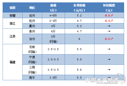 | 中國水產(chǎn)頻道原創(chuàng)報道, 新魚還未上市,行情總體利好,5月草魚價格還將上漲 文/ 水產(chǎn)前沿 鄭鵬飛 魚車排隊搶魚 一周要聞 最近有江蘇養(yǎng)殖戶表示淡水魚行情真的好了,養(yǎng)殖戶終于看到希望。據(jù)了解,昨天鹽城地區(qū)塘頭再現(xiàn)魚車排隊搶魚現(xiàn)象,當天1.2斤的鯽魚從9.3元/斤漲到最高9.7元/斤,而且大草魚也表現(xiàn)出不夠賣,6斤的草魚已經(jīng)從之前的4塊多直奔6元大關(guān),4.5斤的花鰱已經(jīng)突破7元/斤,安徽淮南地區(qū)5斤的草魚最新塘頭價也已經(jīng)賣到6元/斤。最近,湖北隨州地區(qū)草魚漲了0.5元/斤,塘頭價最高已經(jīng)賣到5.3元/斤,湖南長沙地區(qū)3斤的草魚最新報價5元/斤,近期河南開封地區(qū)2斤的草魚最高上漲了0.5元/斤。目前河北唐山地區(qū)草魚最新報價4.8-5元/斤,這兩天行情開始有所好轉(zhuǎn)。遼寧沈陽地區(qū)最新塘頭價4.7元/斤,較上周上漲0.3元/斤。 雖然“五一”之后一些地區(qū)草魚行情表現(xiàn)低迷,華南部分地區(qū)塘頭價下滑也是比較明顯。不過,從最新市場釋放出的搶魚信號以及往年的經(jīng)驗來看,五月份草魚行情還是有望進一步上漲的。是有養(yǎng)殖戶表示,因為在5月下旬到端午節(jié)前夕這段時間很多地區(qū)存塘草魚基本賣完,而新魚還沒有上市,所以預(yù)計這段時間草魚價格會有較快上漲。 今日行情 華南地區(qū) 上周華南地區(qū)持續(xù)的陰雨天氣加上節(jié)后消費的回落,草魚行情整體上也是表現(xiàn)相對疲軟,養(yǎng)殖戶對于五一節(jié)后行情大漲的期待也是再次遇到阻力。目前大部分養(yǎng)殖戶賣魚積極性不是很高,對于5月行情的走勢也是表現(xiàn)出信心不足。據(jù)了解,上周珠三角地區(qū)的草魚塘頭價基本沒有怎么漲,江門地區(qū)3-7兩的苗種低的依然只賣到3.8元/斤,江門、中山、廣州等地大部分養(yǎng)殖戶表示行情沒得救了,5月份上漲估計很難;近期廣西貴港地區(qū)草魚也是有價無市,最新塘頭價5.1元/斤;目前肇慶地區(qū)3斤草魚最新報價4.7元/斤,有養(yǎng)殖戶表現(xiàn)出難得的樂觀態(tài)度,認為5月份應(yīng)該會漲。對于之前的報價留言中有養(yǎng)殖戶反映的廣西地區(qū)網(wǎng)箱草魚已經(jīng)成為歷史的問題,我們從養(yǎng)殖戶了解到,來賓,桂林等地區(qū)網(wǎng)箱基本沒有了,不過隨著國家對于一刀切問題的重視,目前南寧周邊以及橫縣、梧州等地區(qū)仍保留有部分網(wǎng)箱養(yǎng)殖。 江門:本周江門地區(qū)草魚行情整體表示低迷,目前3-7兩的草魚苗種塘頭價仍然低至3.8元/斤,養(yǎng)殖戶表示5月份可能還是難漲。 肇慶:目前肇慶地區(qū)草魚行情基本維持穩(wěn)定,目前3斤的草魚最新塘頭價4.7元/斤。有養(yǎng)殖戶表示可能價格起不來了,順其自然吧,不過也有養(yǎng)殖戶依然堅信5月份草魚價格應(yīng)該會漲。 梅州:據(jù)業(yè)內(nèi)人士介紹,目前梅州地區(qū)3斤的草魚最新塘頭價5.2-5.3元/斤,雖然價格變化不大,但是近期流通量較之前是大了一些,預(yù)計5月份可能還是以穩(wěn)定為主。 中山:受到成魚行情回落的影響,最近草魚養(yǎng)殖戶投苗的積極性有所下降,最近中山地區(qū)的草魚整體行情出現(xiàn)疲軟,有流通商甚至表示5月份草魚行情可能沒得救了。 廣西:本周廣西地區(qū)草魚整體行情也是不太好,據(jù)養(yǎng)殖戶介紹目前貴港地區(qū)草魚有價無市,最新塘頭價5.1元/斤。去年廣西的網(wǎng)箱強拆受到重視之后,目前來賓,桂林等地區(qū)網(wǎng)箱基本沒有了,但是目前南寧周邊以及橫縣、梧州等地區(qū)仍有部分網(wǎng)箱養(yǎng)殖。 華中地區(qū) 從最新了解到的情況來看,近期華中地區(qū)草魚行情整體仍保持回暖趨勢。據(jù)養(yǎng)殖戶介紹,最近幾天湖北隨州地區(qū)草魚漲了0.5元/斤,塘頭價最高已經(jīng)賣到5.3元/斤;湖南長沙地區(qū)的草魚呈現(xiàn)上漲勢頭,養(yǎng)殖戶惜售,幾乎沒有人賣魚,目前3斤的草魚最新報價5元/斤;近期河南開封地區(qū)草魚也是有上漲趨勢,目前4-5斤的草魚最高賣到5.6元/斤,部分地區(qū)2斤的草魚上漲了0.5元/斤。雖然目前江西大部分地區(qū)行情還是不好,樟樹、南昌、新余等地區(qū)草魚難賣,小規(guī)格的依然只有3.7元/斤,3斤以上的賣4.1-4.2元/斤,目前幾乎沒有人賣魚。但是有養(yǎng)殖戶表示,因為在5月下旬到端午節(jié)前夕這段時間當?shù)卮嫣留~基本賣完,而新魚還沒有上市,所以預(yù)計這段時間草魚價格會有較快上漲。 江西:本周江西地區(qū)草魚行情整體上比較低迷,最新塘頭價沒有太大變化。有養(yǎng)殖戶表示,目前南昌地區(qū)草魚還是很難賣,價格也是沒有明顯好轉(zhuǎn),目前2斤的草魚塘頭價還是只有4塊多;新余地區(qū)草魚市場批發(fā)價4.7元/斤,目前周邊養(yǎng)殖戶幾乎沒有人賣魚;樟樹地區(qū)草魚還是不好賣,預(yù)計5月份行情還是難漲,目前小規(guī)格的最新報價3.7元/斤,3斤以上的賣4.1-4.2元/斤;目前贛州地區(qū)草魚塘頭價還是以平穩(wěn)為主,有養(yǎng)殖戶表示5月下旬到端午節(jié)前夕草魚價格會有較快上漲,因為這段時間當?shù)卮嫣留~應(yīng)該已經(jīng)賣完,而新魚基本還沒有達到上市規(guī)格。 湖北:本周湖北地區(qū)草魚行情整體保持穩(wěn)定,部分地區(qū)再次出現(xiàn)上漲。據(jù)養(yǎng)殖戶介紹,最近武漢地區(qū)草魚