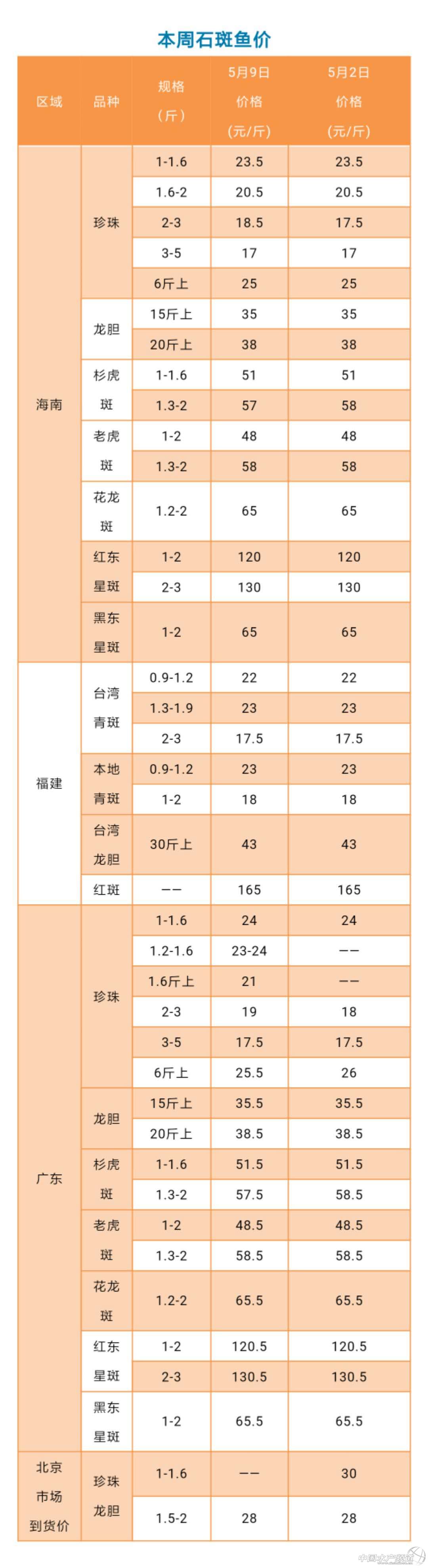 | 中國水產(chǎn)頻道原創(chuàng)報道, 海南、福建、廣東、北京石斑魚報價!珍珠龍膽、青斑、老虎斑、杉虎斑、龍膽、東星斑等價格看這里! 文/ 水產(chǎn)前沿 吳佳輝 石斑商品魚 海南、福建、廣東:幾個地區(qū)2-3斤珍珠價格上漲,大規(guī)格珍珠價格則下滑,杉虎斑價格也下滑明顯。 最近,湛江雷州烏石港魚排網(wǎng)箱養(yǎng)殖的石斑魚疑被污染大量死亡,養(yǎng)殖戶損失慘重,絕大多數(shù)的石斑魚已達到4-5斤規(guī)格,之前因為價格不好惜售,目前等來珍珠價格上漲了,但很多人卻沒有魚了,真令人惋惜。 特別感謝:海南晨海水產(chǎn)有限公司、海南大順發(fā)水產(chǎn)有限公司、萊州明波水產(chǎn)有限公司、廣東上上生物科技有限公司、廣東大順發(fā)水產(chǎn)有限公司為本文提供價格! |