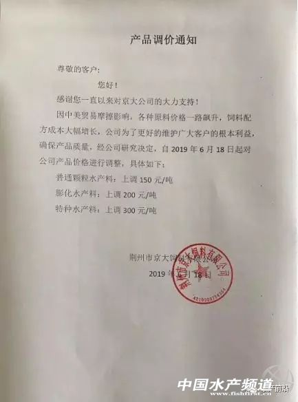 | 中國水產(chǎn)頻道獨家報道, 行情跌宕起伏,豆粕2天內(nèi)暴跌100元/噸,飼料還漲價嗎? 文/ 中國水產(chǎn)頻道 整理 近來,湖北市場甚是令人關(guān)注,原因是這里的水產(chǎn)飼料一波波地漲價! 湖北飼料全線漲價 6月17日,荊州市飼料工業(yè)協(xié)會發(fā)布原料行情分析探討會通過水產(chǎn)飼料漲價決議。決議稱,因中美貿(mào)易摩擦影響,飼料原料價格一路飆升,飼料配方成本大幅增長,企業(yè)壓力山大。荊州市飼料工業(yè)協(xié)會于6月17日召開探討會,磋商、討論、分析市場行情走勢,提出應(yīng)對方案,解決當(dāng)前困難。參會飼料企業(yè)負(fù)責(zé)人一致同意6月18日開始執(zhí)行漲價政策:建議具體調(diào)價幅度為:1、普通顆粒水產(chǎn)料漲價150元/噸;2、膨化水產(chǎn)料漲價200元/噸;3、特種水產(chǎn)料漲價300元/噸。 而實際上,在荊州市飼料工業(yè)協(xié)會發(fā)布飼料漲價之前,已有不少企業(yè)頂不住壓力,上調(diào)了飼料價格。 6月7日武漢正大水產(chǎn)宣布漲價:特種魚(包含青蛙料、鲌魚料、泥鰍料、鱸魚料、黃顙料、X0#)價格上調(diào)100元/噸。 6月15日武漢大北農(nóng)宣布漲價:常規(guī)顆粒料上漲150元/噸,草魚膨化料、特種膨化料上漲200元/噸。 緊接著,6月18日起荊州市京大飼料有限公司宣布漲價:上漲幅度為:普通顆粒水產(chǎn)料,上調(diào)150元/噸;膨化水產(chǎn)料,上調(diào)200元/噸;特種水產(chǎn)料,上調(diào)300元/噸。 6月18日洪湖海大宣布飼料漲價。6月19日天門海大、天門通威宣布飼料漲價,兩企業(yè)的普通顆粒料和普通膨化料上漲的幅度一致,為200-300元/噸。三個公司調(diào)價時間均為6月21日零時執(zhí)行。 另外,漢川恒興表示或者6月22日漲價,武漢澳華預(yù)計6月25日漲價。華中粵海劉總暫時不漲。 談判有望再度啟動,國內(nèi)豆粕應(yīng)聲暴跌 據(jù)悉,近日中美貿(mào)易再度啟動談判,業(yè)界預(yù)測有望達(dá)成協(xié)議。昨天、今日豆粕主流報價連續(xù)高位大幅暴跌回落,累計疊加較6月17日最高點跌了100元/噸。 豆粕價格下跌,對料企生產(chǎn)壓力可起到緩解作用,或者猛烈的漲價勢頭有望得到遏制。 6月29日飼料原料價格表 6月20日飼料原料價格表 附各大料企漲價通知: 天門海大飼料有限公司調(diào)價通知 洪湖海大漲價通知 受中美貿(mào)易戰(zhàn)影響,從5月開始大宗原料暴漲。為保證產(chǎn)品質(zhì)量,經(jīng)公司研究決定,從2019年6月21日零時開始,公司魚種料、混養(yǎng)成魚料上漲100元/噸,草魚膨化料上漲150元/噸,其他專養(yǎng)料上漲150元/噸。 天門通威生物科技有限公司 荊州市京大飼料有限公司 武漢大北農(nóng)水產(chǎn)科技有限公司漲價通知 武漢正大漲價通知 因原料價格上調(diào),武漢正大水產(chǎn)從6月7日起特種魚(包含青蛙料、鲌魚料、泥鰍料、鱸魚料、黃顙料、X0#)價格上調(diào)100元/噸,敬請相互轉(zhuǎn)告,不便之處,敬請諒解! 荊州市飼料工業(yè)協(xié)會通過水產(chǎn)飼料漲價決議 |