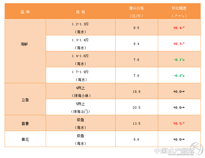 | 中國水產(chǎn)頻道原創(chuàng)報道, 文/ 珠海海龍、水產(chǎn)前沿 吳佳輝 海水特種魚:海鱸級魚存塘少,價格上漲 鱸魚:級魚(1.2-1.4斤,水車)存塘較少,價格上漲較快,中大魚存塘多,需求不大,行情依舊低迷,短期內預計上漲空間不大。 立魚 珠海小林:市場出魚量增加,以大規(guī)格立魚為主(4.8兩上),市場存塘舊魚較多,養(yǎng)戶出魚積極性高,預計后市相對穩(wěn)定。 珠海斗門:立魚價格穩(wěn)定,客戶陸續(xù)開始出魚。 盲曹:今年盲曹苗成數(shù)低,存塘量低。市場仍舊缺魚,價格有機會繼續(xù)上漲。 黃花:存塘量少,今年放苗量不足,新魚量跟不上需求,4成級魚以上8.4元,中大魚成數(shù)越高價格隨之下降,后續(xù)看漲。 |