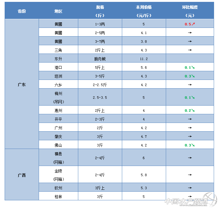 | 中國水產(chǎn)頻道原創(chuàng)報(bào)道, 2018年草魚產(chǎn)量暴增至550萬噸,行情深陷低谷。吃魚還有這些好處你可能不知道,拯救草魚從吃魚開始! 文/ 水產(chǎn)前沿 鄭鵬飛 一周要聞 由于2017年下半年草魚行情大漲,使得養(yǎng)殖戶投苗熱情高漲,全國池塘養(yǎng)殖面積不減反增,草魚養(yǎng)殖量明顯增加。中國漁業(yè)年鑒數(shù)據(jù)顯示,2018年草魚產(chǎn)量相比2017年增加約16萬噸,總產(chǎn)量達(dá)到550萬噸。這也導(dǎo)致了2018年下半年開始草魚行情一路走低,草魚行情一度陷入低谷。除了產(chǎn)量增加的影響外,草魚消費(fèi)市場疲軟也是導(dǎo)致行情低迷一個(gè)主要原因。草魚作為淡水魚養(yǎng)殖的第一品種,其實(shí)有著很大的消費(fèi)潛力有待挖掘,其中就有兩個(gè)重大發(fā)現(xiàn)很多人可能還不知道。 發(fā)現(xiàn)之一:吃魚可以提高智商。2018年12月21日,《科學(xué)報(bào)道》(ScientificReports)雜志發(fā)布了一項(xiàng)針對541名9-11歲的中國學(xué)生的最新調(diào)查研究結(jié)果,每周至少吃魚一次的兒童睡眠更好,平均智商分?jǐn)?shù)(IQ)高出四分之一。 發(fā)現(xiàn)之二:吃魚可以預(yù)防帕金森病(老年癡呆癥之一)。2018年4月3日,ScientificReports上發(fā)表的一項(xiàng)研究成果揭示了吃魚能夠防止腦部的神經(jīng)退行性疾病。研究證明魚類中的小清蛋白可以通過腸道轉(zhuǎn)運(yùn)到吃魚人的血液和大腦中,可以與α突觸核蛋白結(jié)合并有效地清除它們,從而清除帕金森病。 多吃水魚,既能夠提高兒童的智商,又能夠預(yù)防老年癡呆。大家多多轉(zhuǎn)發(fā),拯救草魚,掀起淡水魚的消費(fèi)熱潮從我開始! 一周行情 華南地區(qū) 受華中、華東熱水魚和魚病的影響,近期華南地區(qū)草魚成魚價(jià)格也是再次出現(xiàn)下滑,近期新魚逐漸上市,預(yù)計(jì)短期內(nèi)草魚價(jià)格上漲難度較大。 中山:近期持續(xù)高溫天氣,出魚損耗較大,流通市場相對疲軟。目前,中山坦洲地區(qū)2斤的草魚最新塘頭價(jià)4.1-4.3元/斤,行情低迷,出魚壓力大。由于近期魚塘補(bǔ)苗量較大,草魚種存量有所下降,目前黃圃地區(qū)1-3兩草魚種賣5元/斤左右,2-5兩4.1元/斤,3-7兩3.8元/斤,后期有望上漲。 肇慶:本周肇慶地區(qū)3斤的草魚塘頭價(jià)穩(wěn)定在4.7元/斤,暫時(shí)沒有明顯波動(dòng)。 梅州:從業(yè)內(nèi)人士了解到,目前廣東梅州地區(qū)3斤的草魚塘頭價(jià)穩(wěn)定在5元/斤。 惠州:據(jù)了解,目前惠州博羅地區(qū)小規(guī)格的草魚苗苗種存塘不多,價(jià)格有所上升,目前統(tǒng)鯇最新報(bào)價(jià)4元/斤,下滑0.2元/斤;潼湖地區(qū)2斤左右草魚賣4.2元/斤。 廣州:目前廣州地區(qū)統(tǒng)鯇最新塘頭價(jià)4.2-4.3元/斤,價(jià)格相對穩(wěn)定,賣魚積極性較低。 佛山:目前2斤以上草魚價(jià)格為4.2元/斤左右,價(jià)格小幅下滑;大草魚存塘比較多,養(yǎng)殖戶賣魚壓力較大。 廣西:本周廣西地區(qū)草魚價(jià)格整體上還是保持穩(wěn)定。目前,南寧地區(qū)2-4網(wǎng)箱草魚穩(wěn)定在5.8-6元/斤;有養(yǎng)殖戶反映,現(xiàn)在貴港地區(qū)魚中找魚比較積極,2斤的草魚也開始收了,2-5斤的塘頭價(jià)穩(wěn)定在5.5元/斤左右;據(jù)了解,近期桂林地區(qū)有湖南草魚賣過去,本地草魚不太好賣,最新塘頭價(jià)5元/斤。 華中地區(qū) 湖北:受到梅雨天氣影響,近期湖北地區(qū)草魚出血病爆發(fā),二齡大草魚死亡嚴(yán)重。本周湖北洪湖地區(qū)草魚價(jià)格再次回落,2斤的草魚只賣到3.8-3.9元/斤。武漢地區(qū)大草魚價(jià)格還可以,但是小草魚依然低迷,其中2斤的只賣到3.1-3.4元/斤,3斤左右的賣3.7元/斤,4斤以上4.5元/斤。仙桃地區(qū)草魚發(fā)病嚴(yán)重,價(jià)格也是有小幅下滑,大規(guī)格草魚比較好賣。湖北隨州地區(qū)目前價(jià)格保持穩(wěn)定。 湖南:最近,湖南地區(qū)草魚消費(fèi)市場還是疲軟,部分地區(qū)價(jià)格有小幅下滑。其中,常德地區(qū)很多塘口開始發(fā)病,加上受到熱水魚的影響價(jià)格出現(xiàn)下滑,2-3斤草魚塘頭賣3.9元/斤;岳陽、益陽、株洲等地存塘減少,目前價(jià)格基本持平;安鄉(xiāng)地區(qū)草魚疾病高發(fā),魚價(jià)繼續(xù)下行。 江西:近期江西地區(qū)受到洪澇災(zāi)害影響,出魚受阻,價(jià)格有漲有跌。其中,吉安地區(qū)外地魚販增加,魚價(jià)有小幅上漲;南昌地區(qū)草魚價(jià)格下滑嚴(yán)重,1.5-2斤草魚只賣到3.1元/斤。 河南:本周河南地區(qū)的草魚行情也是出現(xiàn)明顯下滑。據(jù)養(yǎng)殖戶介紹,目前鄭州地區(qū)草魚塘頭只賣到4.6元/斤,相比6月初的5.6元/斤下滑了1元/斤;開封地區(qū)2斤的草魚目前只賣到4.3元/斤,下滑0.2元/斤。 華東地區(qū) 福建:本周福建地區(qū)的草魚塘頭價(jià)還是繼續(xù)保持穩(wěn)定,目前三明、南平、龍巖大部分地區(qū)2-3斤的草魚塘頭價(jià)維持在5.6元/斤。近期受到洪水加上極端天氣影響,網(wǎng)箱魚存塘壓力加大,養(yǎng)殖戶希望能適當(dāng)賣魚以減小存塘風(fēng)險(xiǎn)。 江蘇:本周江蘇地區(qū)的草魚行情還是比較低迷,出魚很慢,部分地區(qū)價(jià)格也是再次出現(xiàn)下滑。據(jù)養(yǎng)殖戶介紹,目前鹽城地區(qū)4-6斤左右草魚塘價(jià)只有4.4元/斤左右,下滑0.1元/斤,射陽市場大規(guī)格草魚比較缺;淮安地區(qū)的草魚價(jià)
