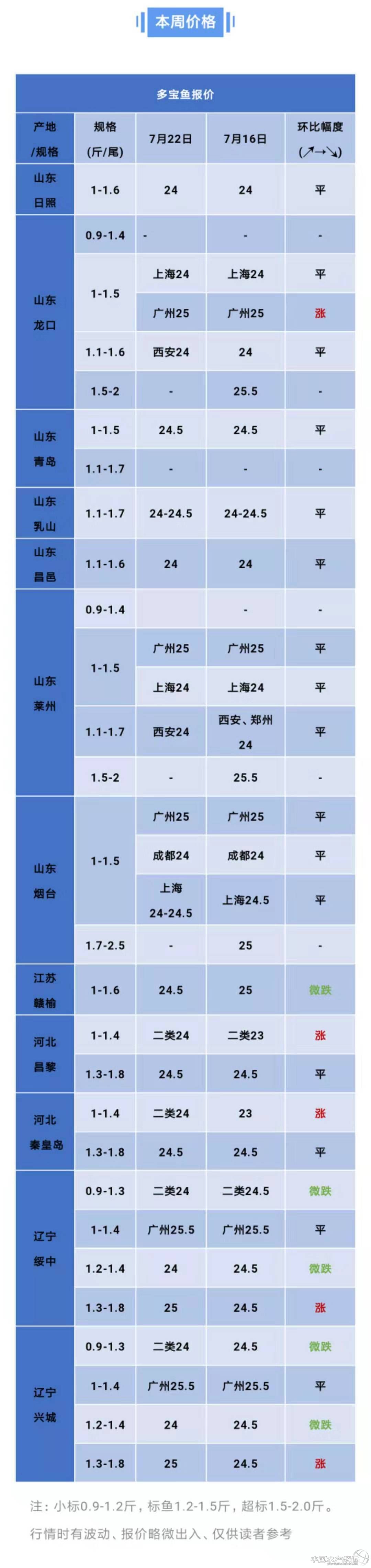 | 中國水產(chǎn)頻道原創(chuàng)報(bào)道, 本周行情 上周多寶魚幾乎全線上漲,而且最高漲幅達(dá)到1.5元/斤,讓業(yè)界看到一線希望。本周,多寶魚價(jià)格波動(dòng)不大,多地魚價(jià)維穩(wěn)。但是河北、遼寧地區(qū)個(gè)別規(guī)格魚依舊有“漲”聲,漲幅0.5元/斤,同樣是遼寧地區(qū)小規(guī)格的魚行情有波動(dòng),微跌0.5元左右。 養(yǎng)殖戶反映高溫天氣到來,多寶魚養(yǎng)殖難度也會(huì)加大,現(xiàn)在都沒有大魚了,一般到了標(biāo)魚規(guī)格就可以賣了,不然風(fēng)險(xiǎn)就會(huì)增加。流通商表示由于天氣熱起來了,養(yǎng)殖戶出魚挺積極的,目前暫時(shí)供需平衡,魚價(jià)還會(huì)保持平穩(wěn)。但隨著存魚量減少,業(yè)內(nèi)人士表示大魚緊缺,8月還有漲價(jià)的空間,建議養(yǎng)殖戶要理性看待行情,做好出魚規(guī)劃,讓多寶魚行業(yè)良性發(fā)展! 希望所有的多寶魚養(yǎng)殖戶加強(qiáng)溝通,讓信息更通暢一些,每個(gè)人都能賣出高價(jià),好價(jià)! |