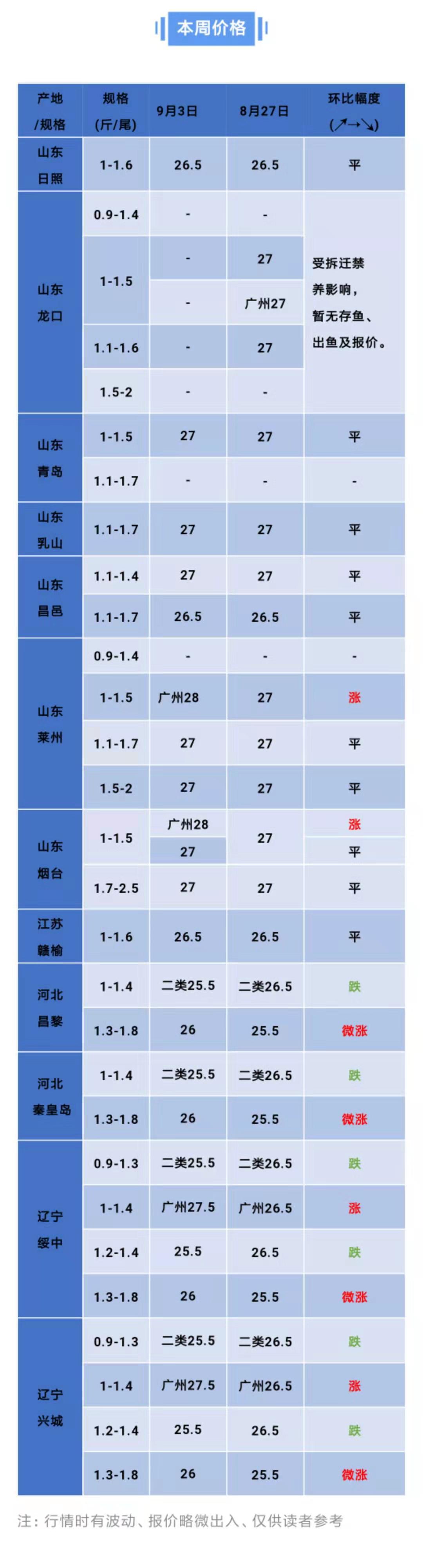 | 中國水產(chǎn)頻道原創(chuàng)報道, 中秋節(jié)臨近,漲價空間大!部分地區(qū)遭拆遷! 文 | 表 工業(yè)化水產(chǎn)圈 實習(xí)編輯 張河長 本周行情 本周遼寧、河北地區(qū)多寶魚價格出現(xiàn)波動,不同規(guī)格魚價漲跌互現(xiàn),而且幅度都在1元左右。山東地區(qū)魚價較為平穩(wěn),但是龍口地區(qū)養(yǎng)殖受“退漁還林”政策影響,大多養(yǎng)殖戶都以統(tǒng)價出魚,大魚、優(yōu)質(zhì)魚也失去價格優(yōu)勢。當(dāng)?shù)貥I(yè)內(nèi)人士表示,去年底至今養(yǎng)殖棚減少了近400個! 部分地區(qū)的流通商表示:中秋節(jié)即將到來,現(xiàn)在市場中總體存魚量少,近期豬價持續(xù)上漲,預(yù)計多寶魚漲價空間較大!此外,也有業(yè)內(nèi)人士表示節(jié)日過后魚價可能會有所下跌,建議養(yǎng)殖戶根據(jù)具體情況合理出魚。 希望所有的多寶魚養(yǎng)殖戶加強(qiáng)溝通,讓信息更通暢一些,每個人都能賣出高價,好價! |