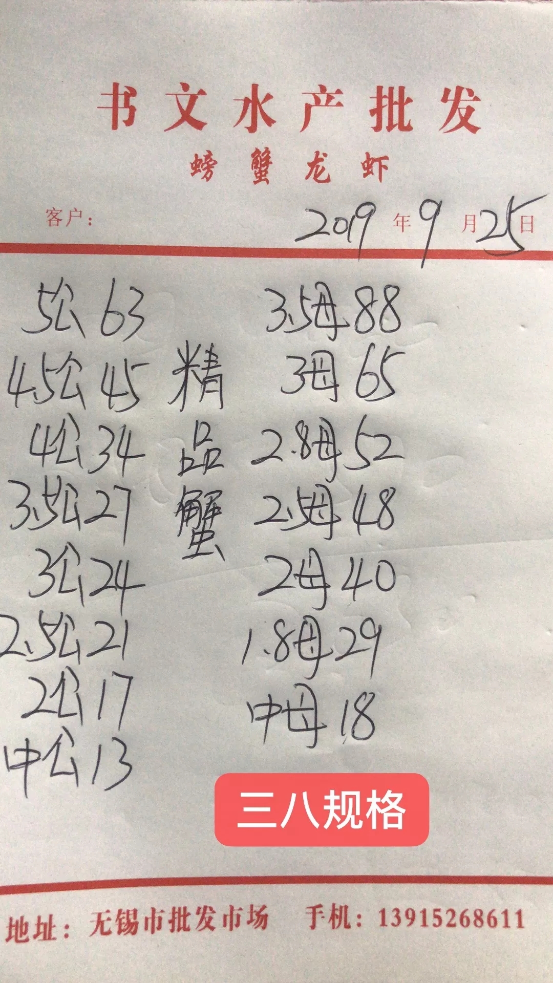 | 中國(guó)水產(chǎn)頻道原創(chuàng)報(bào)道, 行情分析 與昨天相比,興化今天蟹價(jià)基本未變。 高淳今天大規(guī)格公蟹價(jià)格未變,小規(guī)格公蟹下跌2-5元/斤。3.5母跌10元/斤,跌幅最大。3母、2.8母分別上漲5元/斤、2元/斤。 泗洪大部分規(guī)格下跌1元/斤。 ——蝦蟹前沿 現(xiàn)階段賣蟹策略:母蟹多捕多賣,公蟹捕小留大,搞暫養(yǎng)待價(jià)而沽。3.5公以上暫不出售,大公蟹有上漲的空間,過(guò)了重陽(yáng)大公蟹會(huì)有好價(jià)錢(qián)! ——老汪論蟹 今日參考價(jià) 興化 此報(bào)價(jià)由興化丁老板提供 高淳 此報(bào)價(jià)由江蘇好潤(rùn)固城湖店劉坤提供 此報(bào)價(jià)由江蘇好潤(rùn)獅樹(shù)店田玲提供 此報(bào)價(jià)由江蘇好潤(rùn)固城湖店劉坤提供 盤(pán)錦 此報(bào)價(jià)由盤(pán)錦王老板提供 泗洪 此報(bào)價(jià)由泗洪孫老板提供 宣城 此報(bào)價(jià)由宣城劉老板提供 馬鞍山 此報(bào)價(jià)由江蘇好潤(rùn)塘南店張悅提供 無(wú)錫 此報(bào)價(jià)由無(wú)錫王老板提供 近日交易價(jià) 此報(bào)價(jià)由江蘇臨澤劉老板提供 此報(bào)價(jià)由江蘇好潤(rùn)固城湖店劉坤提供 此報(bào)價(jià)由江蘇好潤(rùn)固城湖店劉坤提供 |