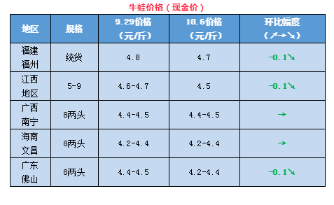 | 中國(guó)水產(chǎn)頻道原創(chuàng)報(bào)道, 本周牛蛙、泰蛙最新行情報(bào)價(jià) 文/ 水產(chǎn)前沿 陳曉慶 一周行情簡(jiǎn)析 牛蛙 十一節(jié)假日期間牛蛙行情較為平穩(wěn),部分地區(qū)價(jià)格略微下跌。今日福建福州牛蛙現(xiàn)金價(jià)4.7元/斤,欠賬5.2元/斤,相比上周下降了0.1元/斤;福建廈門(mén)5-9規(guī)格4.6元/斤,4-8規(guī)格4.4元/斤。江西5-9規(guī)格收4.5元/斤,相比上周下降了0.1元/斤;廣東佛山8兩頭牛蛙報(bào)價(jià)4.2-4.4元/斤,相比上周下降了0.1-0.2元/斤;廣西南寧、海南文昌8兩頭牛蛙分別報(bào)價(jià)4.4-4.5、4.2-4.4元/斤,與上周持平。 牛蛙存欄過(guò)多,小長(zhǎng)假期間市場(chǎng)消費(fèi)的增大也沒(méi)能拉動(dòng)價(jià)格的上漲。牛蛙市場(chǎng)消費(fèi)大部分來(lái)自餐飲而非日常家庭,目前“吃蟹正當(dāng)時(shí)”,有業(yè)內(nèi)人士認(rèn)為,現(xiàn)在大閘蟹的火熱也給牛蛙消費(fèi)帶來(lái)了一定的沖擊。大部分養(yǎng)殖戶(hù)將希望寄托在中秋和黃金周兩個(gè)節(jié)假日,然而都沒(méi)有漲上來(lái),而澄海的牛蛙還有一個(gè)多月就要上市(農(nóng)歷十月份前后),存欄的蛙剩下的機(jī)會(huì)顯然已經(jīng)不多了。 泰國(guó)虎紋蛙 節(jié)假日期間泰蛙行情終于止跌,迎來(lái)了全面的上漲。海南文昌6兩頭今日?qǐng)?bào)價(jià)3.2元/斤,相比上周上漲了0.2元/斤,廣東佛山6兩頭報(bào)價(jià)3.4-3.6元/斤,相比上周上漲了0.4元/斤,上漲幅度最大,廣西南寧6兩頭報(bào)價(jià)3.8-4.2元/斤,相比上周上漲了0.2元/斤,價(jià)格最高。 小長(zhǎng)假期間市場(chǎng)消費(fèi)需求量增大,拉動(dòng)了泰蛙價(jià)格的上漲。經(jīng)過(guò)了近一段時(shí)間來(lái)的市場(chǎng)消耗,中批蛙、大蛙的存欄量有所減少,后期市場(chǎng)行情還有上漲的趨勢(shì)。 |