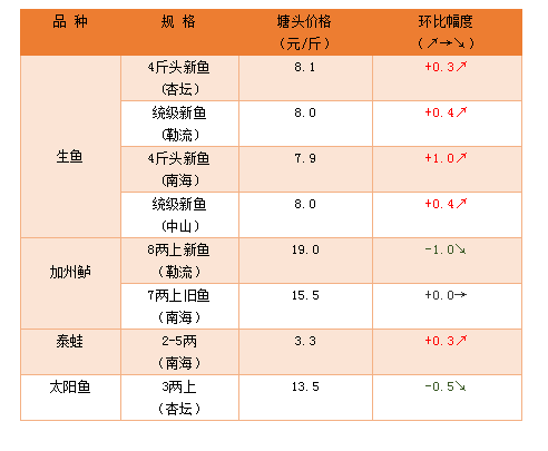 | 中國(guó)水產(chǎn)頻道原創(chuàng)報(bào)道, 文/ 珠海海龍、水產(chǎn)前沿 吳佳輝 淡水特種魚:節(jié)后生魚價(jià)格反彈大漲 生魚 順德杏壇:新魚4斤頭左右統(tǒng)級(jí)8.0-8.3元。分級(jí)2斤上8.7-8.9元,2斤下6.3-6.5元。2斤上大魚漲0.1-0.2元/斤,中魚維穩(wěn)。新魚開始上市,舊魚價(jià)格穩(wěn)中有升。天氣漸涼,投喂增加,還需做好內(nèi)服保健與魚塘水質(zhì)管理。 勒流區(qū)域:節(jié)后魚價(jià)反彈,走量保持樂觀,但舊魚存塘依舊不少,北方進(jìn)入賣魚階段對(duì)南方魚價(jià)會(huì)有一定影響。近期生魚投喂量大,可以適當(dāng)肝腸利建/蚌毒靈護(hù)肝,勤加改底。 南海西樵九江:黃金周之后,魚價(jià)在經(jīng)歷短暫下跌后,又迎來上漲的希望。目前4~6斤頭,兩斤上8.6~8.8元,兩斤下6.6~6.8元,后續(xù)行情雖然看好,但是短期內(nèi)上漲的空間不大,還是建議養(yǎng)殖戶有序賣魚,不要被市場(chǎng)風(fēng)向左右,隨意撻定。 中山區(qū)域:節(jié)后生魚價(jià)格保持穩(wěn)定,2斤上大魚8.7-8.9元,2斤下6.3-6.5元,7成左右大魚統(tǒng)貨8-8.2元;市場(chǎng)上存塘成品魚越來越少,后市價(jià)格行情看好。 |