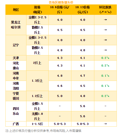 | 中國水產(chǎn)頻道原創(chuàng)報(bào)道, 存塘很多,出魚難走量,怎么辦? 文/ 水產(chǎn)前沿 葉豐齊 本周,各地區(qū)鯉魚行情一覽。 東北地區(qū):行情暫時(shí)穩(wěn)定,但出魚不走量;黑龍江哈爾濱2.3-2.5斤以上規(guī)格全鱗鯉魚4元/斤,同上周;1.7-1.8斤起步開抓、2.5斤以上規(guī)格的散鱗鏡鯉約4.5元/斤,同上周;遼寧2.3-2.5斤以上規(guī)格的全鱗鯉魚約4元/斤,同上周;2.1-2.5規(guī)格的散鱗鏡鯉約4.6-4.7元/斤,2.5斤以上規(guī)格的約4.8元/斤,同上周價(jià)格。馬上到封冰時(shí)期,業(yè)內(nèi)人士預(yù)計(jì)半個(gè)月后鯉魚行情有可能上行。 河北唐山和天津地區(qū):大部分新魚夠規(guī)格大量上市,而拉魚的水車依然少;1.8斤以上規(guī)格的鯉魚約4.1元/斤,環(huán)比上周下跌0.2元/斤;皮相沒那么好的鯉魚,價(jià)格還會更低一些;存塘量還有三分之二,長期來看魚價(jià)可能下行。 河南地區(qū):鯉魚存塘甚多,走量十分艱難,1.3斤以上規(guī)格,鄭州中牟4.7元/斤、洛陽4.5元/斤,環(huán)比上周下跌0.1元/斤。年底前是否還有上漲的可能呢? 寧夏銀川:目前是豐收季,鯉魚大量上市,供過于求;1.2斤以上規(guī)格鯉魚4.8元/斤,環(huán)比上周下跌0.2元/斤。長期看穩(wěn)中有跌。 四川地區(qū):受外地魚沖擊,加上近期當(dāng)?shù)爻鲷~較集中,目前走量困難,行情持續(xù)下行;全鱗1.5-2斤以上規(guī)格5.6元/斤,環(huán)比兩周前下跌0.4元/斤;無鱗鯉魚1.8-2斤規(guī)格的5.6元/斤,環(huán)比兩周前下跌0.7元/斤。有什么辦法扭轉(zhuǎn)頹勢呢? 廣西地區(qū):鯉魚目前行情較穩(wěn)定,基本保持在5-5.3元/斤的區(qū)間浮動;0.5-1斤規(guī)格5.0元/斤,同上周;1-1.5斤規(guī)格5.3元/斤,和上周的行情一致。在走量普遍艱難的時(shí)期,穩(wěn)定比什么都重要。 |
