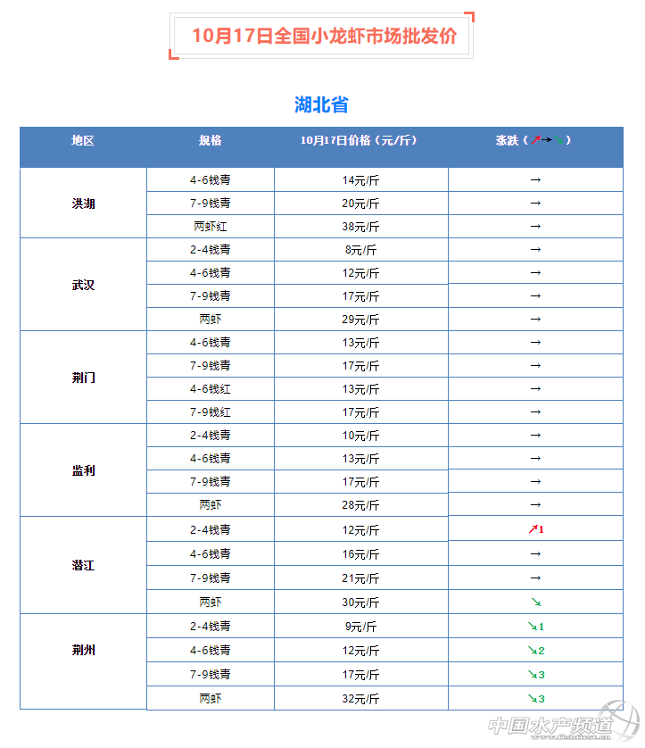 摘要: 中國水產(chǎn)頻道原創(chuàng)報道, 10月17日全國小龍蝦市場批發(fā)價 。