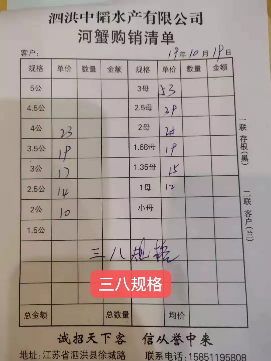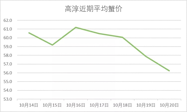 | 中國水產(chǎn)頻道原創(chuàng)報道, 興化持平,高淳精品門市下跌。 蝦蟹行情每日播報 您身邊的行情顧問 歡迎關(guān)注蝦蟹前沿公眾號! 最新行情解析 興化 近期興化蟹價一路走低,今天蟹價與昨天持平,目前平均蟹價為30.8元/斤。 今天興化普通門市蟹價未變。 高淳 本周高淳精品蟹價整體下跌,近4天平均蟹價連續(xù)下跌。今天平均蟹價56.3元/近,為本周最低。目前蟹價,明顯低于去年同期。 今天高淳精品門市價格整體下跌,5公繼續(xù)下跌5元/斤,4.5公跌3元/斤,4公、3.5公跌2元/斤,僅3公漲1元/斤。母蟹方面,3.5母、3母跌5元/斤,2.8母跌3元/斤,2.5母跌2元/斤。 今日參考價 興化 此報價由興化丁老板提供 高淳 此報價由江蘇好潤固城湖店劉坤提供 此報價由江蘇好潤固城湖店劉坤提供 泗洪 此報價由泗洪孫老板提供 無錫 此報價由無錫王老板提供 馬鞍山 此報價由江蘇好潤塘南店張悅提供 宣城 此報價由宣城劉老板提供 |