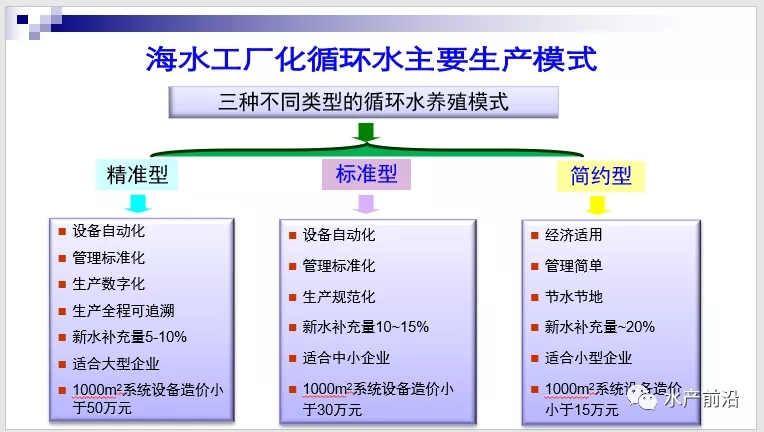 | 中國水產(chǎn)頻道獨(dú)家報(bào)道, 第三屆循環(huán)水養(yǎng)殖技術(shù)培訓(xùn)班正式開班 文/圖 水產(chǎn)前沿 植銀素 “近年來由于環(huán)保壓力,水產(chǎn)養(yǎng)殖尾水排放要求十分嚴(yán)格,這一次我從四川專門過來參加培訓(xùn)班,希望可以找到高效的解決方案。”一養(yǎng)殖戶說道。 與會人員合影 10月21日,由中國農(nóng)業(yè)工程學(xué)會特種水產(chǎn)工程分會、工業(yè)化水產(chǎn)養(yǎng)殖與裝備產(chǎn)業(yè)技術(shù)創(chuàng)新戰(zhàn)略聯(lián)盟主辦的“第三屆循環(huán)水養(yǎng)殖技術(shù)培訓(xùn)班”在山東東營舉辦,會議得到了大連海洋大學(xué)、設(shè)施漁業(yè)教育部重點(diǎn)實(shí)驗(yàn)實(shí)驗(yàn)室、上海海洋大學(xué)設(shè)施漁業(yè)研究室、中國科學(xué)院海洋研究所、浙江大學(xué)生工食品學(xué)院、海洋學(xué)院、中國水產(chǎn)學(xué)會魚類工業(yè)化養(yǎng)殖研究會、中國漁業(yè)協(xié)會智慧漁業(yè)分會、中國智慧漁業(yè)學(xué)院、遼寧省水產(chǎn)設(shè)施養(yǎng)殖與裝備技術(shù)工程研究中心、正大集團(tuán)&大連海洋大學(xué)、水產(chǎn)養(yǎng)殖設(shè)施與裝備研究發(fā)展中心等單位的協(xié)辦支持,吸引了近150名從業(yè)者加入。 大連海洋大學(xué) 劉鷹 教授主持開幕式 劉鷹教授表示隨著工業(yè)化水產(chǎn)養(yǎng)殖發(fā)展,從業(yè)者對于技術(shù)的需求越來越明顯,所以我們每兩年就聚集各方力量舉辦循環(huán)水養(yǎng)殖技術(shù)培訓(xùn)班。很高興能看到來學(xué)習(xí)的學(xué)員越來越多,希望大家都可以在5天課程內(nèi)有所收獲。 中國農(nóng)業(yè)工程學(xué)會特種水產(chǎn)工程分會 秦京光 副秘書長致辭 大連海洋大學(xué) 劉鷹教授:路基工廠化循環(huán)水養(yǎng)殖現(xiàn)狀與趨勢 1、中國水產(chǎn)養(yǎng)殖業(yè)是“永恒”的產(chǎn)業(yè) 截止到2015年,我國水產(chǎn)品總量6699.65萬噸,養(yǎng)殖產(chǎn)量4937.90萬噸。劉鷹教授在報(bào)告中說道:“中國水產(chǎn)養(yǎng)殖業(yè)是永恒的產(chǎn)業(yè)”,到2030年,我國水產(chǎn)品數(shù)量發(fā)展目標(biāo)是總產(chǎn)量達(dá)到7500萬噸,其中養(yǎng)殖產(chǎn)量達(dá)5700萬噸,所以水產(chǎn)養(yǎng)殖的發(fā)展空間仍然很大。 2、工廠化養(yǎng)殖的新進(jìn)展 國內(nèi)陸基工廠化循環(huán)水養(yǎng)殖裝備產(chǎn)業(yè)現(xiàn)狀特點(diǎn): 以養(yǎng)殖工程設(shè)施設(shè)備單元的開發(fā)為重點(diǎn); 以借鑒、模仿、集成國內(nèi)外水處理設(shè)備為特征; 發(fā)明創(chuàng)新了10余項(xiàng)新設(shè)施裝備,在生產(chǎn)中應(yīng)用日益廣泛; 工廠化養(yǎng)殖設(shè)施設(shè)備規(guī);a(chǎn)企業(yè)50余家; 關(guān)鍵設(shè)施設(shè)備已成批量生產(chǎn),全部實(shí)現(xiàn)了國產(chǎn)化。 近年來我國出現(xiàn)部分創(chuàng)新的養(yǎng)殖新設(shè)施設(shè)備填補(bǔ)了國內(nèi)外空白,比如魚病檔案管理系統(tǒng)、自動化控制精準(zhǔn)計(jì)量投餌機(jī)、自動數(shù)魚機(jī)等,我國循環(huán)水設(shè)施設(shè)備全部實(shí)現(xiàn)國產(chǎn)化,而且價(jià)格是國外同類產(chǎn)品的1/3-1/10,但整體來說設(shè)備智能化、穩(wěn)定性仍有提升空間。 目前國內(nèi)常見的三種不同類型的循環(huán)水養(yǎng)殖模式如上圖所示,F(xiàn)場有學(xué)員詢問不同價(jià)格的系統(tǒng)差別在哪里?劉鷹教授表示價(jià)格大部分決定著系統(tǒng)的生產(chǎn)的可控性,自動化水平,風(fēng)險(xiǎn)控制水平,其中新水補(bǔ)充量也有明顯的差距。 國外工廠化循環(huán)水養(yǎng)殖裝備技術(shù)發(fā)展趨勢: 自動化程度不斷提高,車間無人值守; 高新化、規(guī);⑵占盎、產(chǎn)業(yè)化、國際化; 養(yǎng)殖新品種的開發(fā)依賴循環(huán)水養(yǎng)殖技術(shù); 環(huán)境政策、食品安全及綠色消費(fèi)要求進(jìn)一步促進(jìn)循環(huán)水養(yǎng)殖產(chǎn)業(yè)及裝備技術(shù)的發(fā)展。 總結(jié):精準(zhǔn)陸基養(yǎng)殖是未來我國傳統(tǒng)水產(chǎn)養(yǎng)殖模式的重要發(fā)展方向。專業(yè)化、自動化的漁業(yè)裝備是傳統(tǒng)漁業(yè)向現(xiàn)代化發(fā)展的重要保障,通過開展水產(chǎn)養(yǎng)殖裝備研究與應(yīng)用,構(gòu)建水產(chǎn)養(yǎng)殖裝備技術(shù)體系,發(fā)揮工程裝備的支撐協(xié)同作用,我國現(xiàn)代水產(chǎn)水產(chǎn)養(yǎng)殖業(yè)將逐漸呈現(xiàn)出設(shè)施大型化、裝備現(xiàn)代化、生產(chǎn)高效化、效益最大化的產(chǎn)業(yè)發(fā)展態(tài)勢! 中國科學(xué)院海洋研究所 李軍研究員:工業(yè)化水產(chǎn)養(yǎng)殖事宜品種的選擇 循環(huán)水養(yǎng)殖具有高密度,高水流速度的特點(diǎn),因此所選魚種應(yīng)具有集群習(xí)性、可適應(yīng)高密度養(yǎng)殖,耐水流能力,無攻擊性或自殘習(xí)性,適宜配合飼料養(yǎng)殖。另外還要遵循三原則:首先要在工廠化養(yǎng)殖條件下能夠成活,其次是養(yǎng)殖周期事宜(時間較短品種較佳),最后是要“盈利”(高值或者名貴水產(chǎn)品種)。 目前我國工廠化循環(huán)水養(yǎng)殖的海水魚類主要有五大類,包括鲆鰈類、石斑魚類、石鯛魚類、河豚魚類、鮭鱒類等。 中國科學(xué)院海洋研究所 李賢副研
