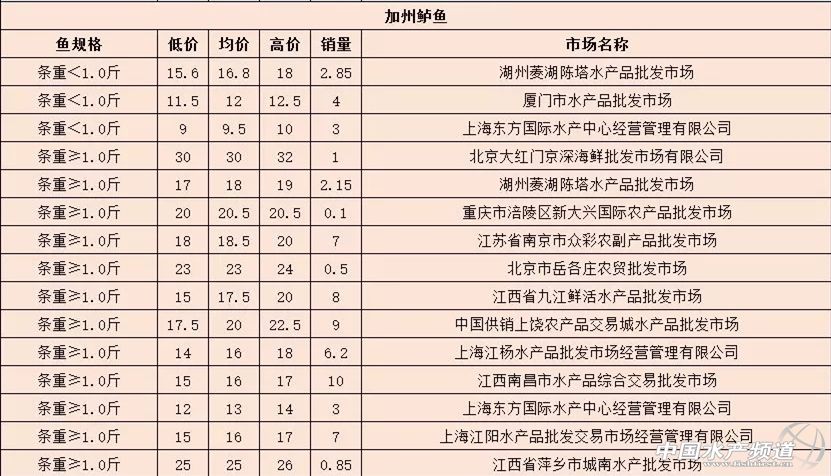 摘要: 中國(guó)水產(chǎn)頻道報(bào)道,10月24日最新加州鱸全國(guó)各地批發(fā)市場(chǎng)價(jià)。