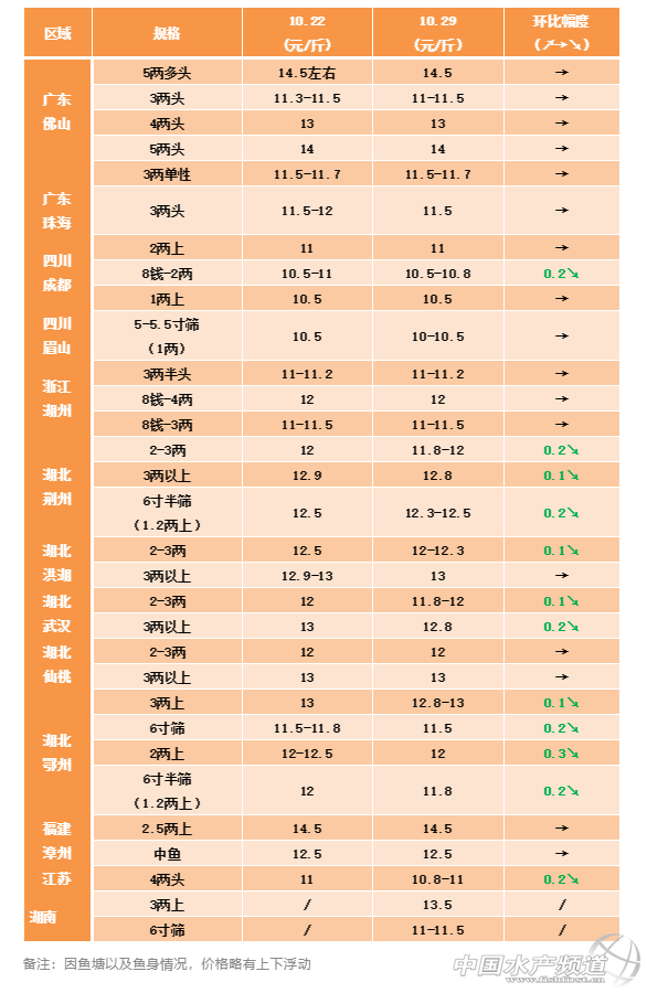 | 中國水產(chǎn)頻道原創(chuàng)報(bào)道, 黃顙魚行情是否還能穩(wěn)得?新魚持續(xù)上市! 文/ 水產(chǎn)前沿 林貞武 最新報(bào)價(jià)、熱點(diǎn)行業(yè)資訊 黃顙魚行情周報(bào)正式發(fā)布 每周相約水產(chǎn)前沿 行情 價(jià)格 “接近年底,有實(shí)力養(yǎng)殖戶可以等到來年開春再賣,但是對于散戶來說,由于飼料款,塘租等都需要付款,基本上很難留到明年,雖然目前行情在下跌,基本上接下來也只能忍著賣掉,養(yǎng)殖戶難呀”一從業(yè)人士如是說。本周行情總體出于微跌現(xiàn)狀,最高下跌0.3元/斤。 廣東,市場行情和上個(gè)禮拜差不多。目前具體價(jià)格上只能是拋網(wǎng)看魚的情況,在挑魚上相對嚴(yán)了點(diǎn),同個(gè)規(guī)格的體色條形燈因素也會造成上下1-2毛錢的波動。個(gè)別4兩炮頭可以賣到14.5元/斤,整體來說隨著新魚的逐步上市,本周走貨量相對有所增加。另外單性黃骨魚目前上市的規(guī)格也有所增加,比雜交貴2-3毛/斤。 湖北,本周行情再次下降,最高下滑0.3元/斤。鑒于上周受軍運(yùn)會影響,買賣魚的商販減少,價(jià)格有所明顯的下跌。雖然省會運(yùn)動會完滿結(jié)束,但是本周魚價(jià)仍未能保持和上周持平,而是微跌,主要受江蘇以及廣東魚對當(dāng)?shù)厥袌龅臎_擊,當(dāng)?shù)爻鲷~量不大。目前3兩上基本保持在13元/斤以內(nèi),而2-3兩規(guī)格已經(jīng)跌破12元。 浙江湖州,本周價(jià)格保持穩(wěn)定,沒啥變化。由于前期黃顙魚高價(jià),近段時(shí)間下跌明顯,不舍得賣,目前有一些養(yǎng)殖戶處于觀望狀態(tài)。據(jù)相關(guān)業(yè)內(nèi)人士透露“目前當(dāng)?shù)匦卖~炮頭基本都有3-4兩,即將大量上市,預(yù)計(jì)接下來短期內(nèi)微跌的可能性更大,基本上每年都是這種規(guī)律,差不多只有等到來年3-4月份時(shí)候才會回漲”。目前8錢-3兩塘頭價(jià)格在11元/斤左右,看魚定價(jià),有能力養(yǎng)殖戶會養(yǎng)到明年規(guī)格達(dá)到5兩炮頭時(shí)候銷往北方市場如北京、上海等地,那時(shí)候價(jià)格就會好很多。 四川,價(jià)格維持低價(jià)狀態(tài)。目前出魚人較多,新魚大量上市對市場行情影響較大,加上外省魚涌入當(dāng)?shù)厥袌觯瑢Ρ镜佤~需求量減少,各個(gè)特種魚價(jià)格都有所下跌,當(dāng)前黃顙魚塘頭5寸上篩10.5元/斤。有養(yǎng)殖戶表示“目前這種價(jià)錢都不想賣了,再冷一段時(shí)間,看看能不能上漲一點(diǎn)”。 福建漳州,本周價(jià)格繼續(xù)與上周持平。受外界影響較小,目前3兩上大魚行情下14.5元/斤,而中則則保持在12.5元/斤左右,總體情況相對保持穩(wěn)定。有當(dāng)?shù)仞B(yǎng)殖戶表示“如果真的在抓魚時(shí)候可能價(jià)格上無法達(dá)到這么高,魚販根據(jù)看魚情況會有所壓價(jià)”。 湖南,3兩上塘頭價(jià)格在13.5元/斤。對比之前有所下滑,而目前江蘇魚走湖北的比較多,出魚多行情算是一般般。 10月29日各大產(chǎn)區(qū)塘頭報(bào)價(jià) |