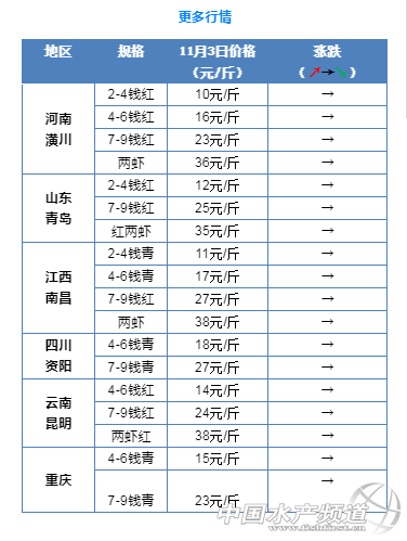 中國水產(chǎn)頻道原創(chuàng)報道, 多地小龍蝦塘頭價出現(xiàn)1元/斤的小幅上漲,批發(fā)行情也是穩(wěn)中有升,小龍蝦整體行情繼續(xù)小幅回升! 蝦蟹行情每日播報 您身邊的行情顧問 歡迎關(guān)注蝦蟹前沿公眾號! 11月3日全國小龍蝦塘頭價 11月3日全國小龍蝦市場批發(fā)價 【關(guān)鍵字】:小龍蝦 塘頭價 市場批發(fā)價 水產(chǎn)養(yǎng)殖 |