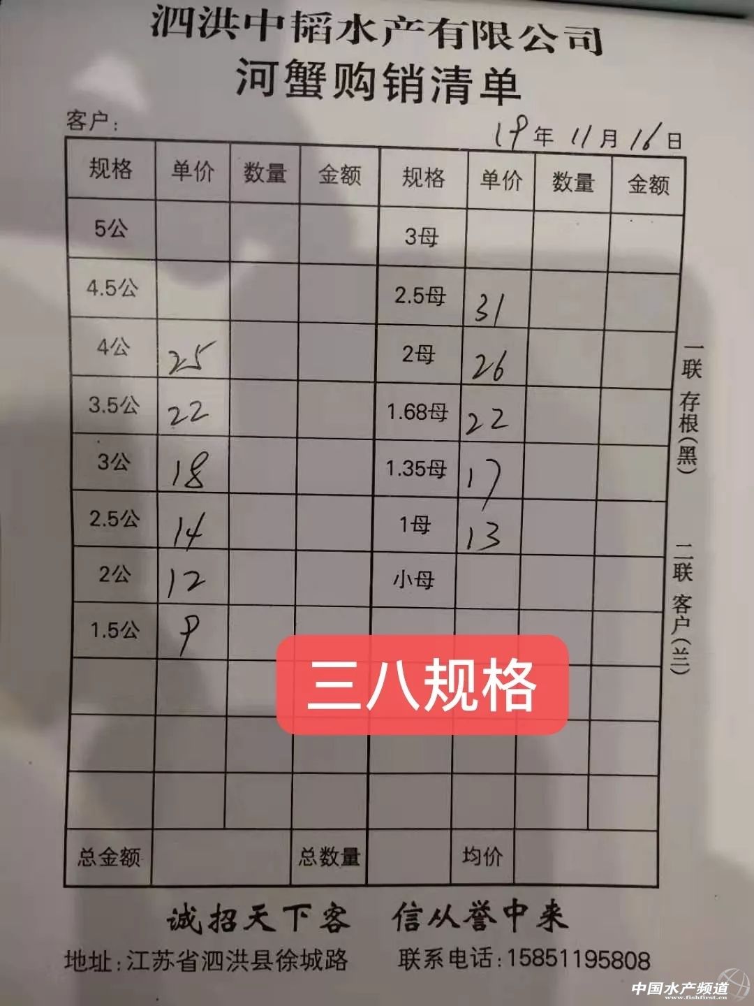 | 中國水產(chǎn)頻道原創(chuàng)報道, 高淳、興化精品蟹價紛紛上漲。 蝦蟹行情每日播報 您身邊的行情顧問 歡迎關(guān)注蝦蟹前沿公眾號! 最新行情解析 高淳 近期高淳精品蟹價整體呈下跌趨勢,但與昨天相比,今天蟹價小幅上漲。與去年同期相比,目前蟹價明顯偏低。 今天高淳精品門市4.5公、4公、3母、2.8母均漲2元/斤,僅2母跌1元/斤,其他規(guī)格蟹價未變。 興化 近期興化精挑蟹價整體呈U字型,自12日下跌之后,今天小幅上漲,其中4.5公、4公、3.5公均漲1元/斤,其他精挑蟹價格未變。 同時,今天興化市場指導(dǎo)價普挑、普貨價格均所有上漲,但幅度不是很大。 今日參考價 興化 高淳 此報價由江蘇好潤固城湖店劉坤提供 泗洪 此報價由泗洪孫老板提供 金壇 此報價由常州楊老板提供 無錫 此報價由無錫王老板提供 宣城 此報價由宣城劉老板提供 |