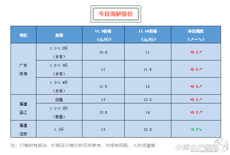 | 中國(guó)水產(chǎn)頻道原創(chuàng)報(bào)道, 文/ 水產(chǎn)前沿 陳曉慶 全新的海鱸行情周報(bào)正式開啟,每周與您相約,歡迎各位讀者交流看法與建議,提供更多地區(qū)價(jià)格行情,讓信息更暢通,讓每個(gè)人都能養(yǎng)好魚、賣好魚! 一周行情簡(jiǎn)析 珠海海鱸:珠海新魚經(jīng)過近三周的接連下滑,終于止跌回漲。1.1-1.2斤報(bào)價(jià)11元/斤,相比上周上漲了0.2元/斤,1.2-1.3斤、1.3-1.4斤規(guī)格的海鱸報(bào)價(jià)分別報(bào)價(jià)11.5元/斤、12元/斤,相比上周上漲了0.5元/斤。 今年頭批魚價(jià)格屢創(chuàng)新高,最高漲到14元/斤,過高的價(jià)格也讓市場(chǎng)一時(shí)間難以接受。不少珠海當(dāng)?shù)氐募庸S都暫時(shí)轉(zhuǎn)做生魚以度過這段海鱸原料過高的時(shí)期。由于市場(chǎng)一時(shí)間的難以接受,以及年底租金到期、清塘趕頭批魚的原因,價(jià)格開始回落到11-12元/斤的水平。經(jīng)過三周的接連下跌,目前海鱸養(yǎng)殖戶也趨于理性,認(rèn)為今年海鱸存塘比往年要少,不必急于在低價(jià)時(shí)把魚賣出。 目前市場(chǎng)上多數(shù)認(rèn)為明年頭批魚青黃不接的趨勢(shì)明顯,對(duì)于明年頭批行情的看好也讓不少養(yǎng)殖戶選擇了搏頭批;另外去年多數(shù)養(yǎng)殖戶前期沒有放苗,后期苗價(jià)過高,不想再重蹈覆轍,所以對(duì)于頭批苗的興趣也有所增高。有業(yè)內(nèi)人士告訴筆者,目前空塘率已經(jīng)超過了3成,比往年大大提高。 據(jù)悉,珠海地區(qū)大概在本月25號(hào)左右就要開始頭批魚的投苗,去年苗價(jià)過高以及對(duì)于明年行情的看好也讓今年的苗價(jià)充滿了變數(shù)。據(jù)福建一海鱸苗場(chǎng)老板表示,去年苗價(jià)太高目前很多苗場(chǎng)都不敢輕易出價(jià),多數(shù)選擇觀望,大概還需等待幾天時(shí)間才會(huì)有具體的價(jià)格出來。也有業(yè)內(nèi)人士表示,今年標(biāo)粗場(chǎng)收苗的價(jià)格比往年還要高一倍左右,頭批苗勢(shì)必要貴一些,但具體還需依靠成數(shù)來定價(jià)。 福建海鱸:本周受供應(yīng)量的影響,福建涵江新舊鱸魚一齊上漲0.2元/斤,涵江1.1-1.3斤新魚價(jià)格14元/斤,老鱸13.2元/斤。詔安鱸魚價(jià)格有所下跌,報(bào)價(jià)12.8元/斤。 |