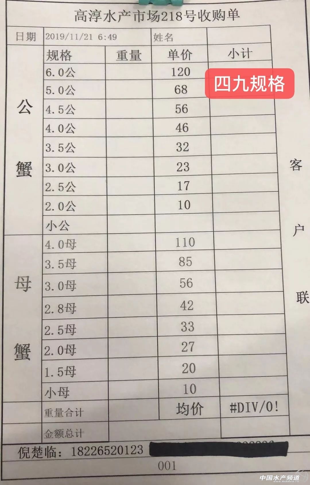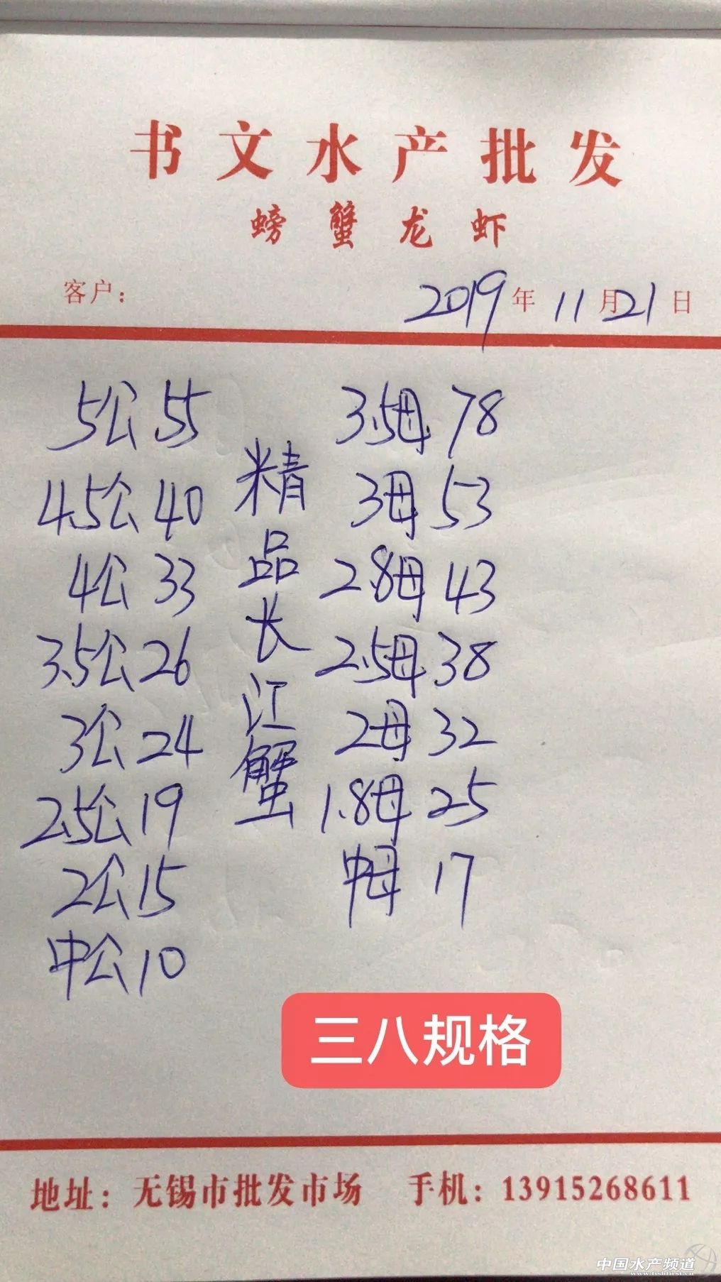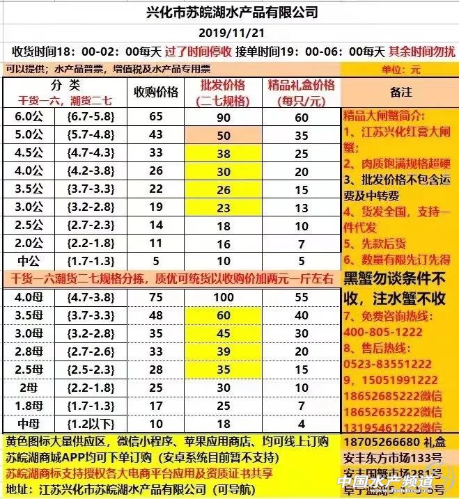 | 中國水產(chǎn)頻道原創(chuàng)報(bào)道, 興化整體上漲。 蝦蟹行情每日播報(bào) 您身邊的行情顧問 歡迎關(guān)注蝦蟹前沿公眾號(hào)! 最新行情解析 高淳 近期高淳精品蟹價(jià)整體呈上漲趨勢(shì),不過今天略有下跌,目前平均蟹價(jià)為47.2元/斤。與去年同期相比,目前蟹價(jià)仍明顯偏低。 今天高淳精品門市4公、2.5母、2母均跌1元/斤,其他規(guī)格蟹價(jià)未變。 興化 近期興化精挑蟹價(jià)整體呈上漲趨勢(shì),今天略有上漲,其中5公漲2元/斤,4公漲1元/斤。同時(shí),今天興化市場指導(dǎo)價(jià)普挑、普貨價(jià)格均有所上漲。 今日參考價(jià) 興化 此報(bào)價(jià)由江蘇好潤馬家蕩店宋利坤提供 此報(bào)價(jià)由江蘇好潤馬家蕩店宋利坤提供 高淳 此報(bào)價(jià)由江蘇好潤固城湖店劉坤提供 泗洪 此報(bào)價(jià)由泗洪孫老板提供 無錫 此報(bào)價(jià)由無錫王老板提供 宣城 此報(bào)價(jià)由宣城劉老板提供 |