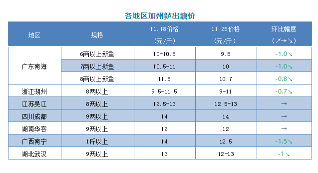 | 中國(guó)水產(chǎn)頻道原創(chuàng)報(bào)道, 文/圖 何氏水產(chǎn)、水產(chǎn)前沿 李靜 加州鱸 本周除江蘇吳江、四川成都、湖南華容價(jià)格保持穩(wěn)定外,其它產(chǎn)區(qū)都有0.5-1.5元/斤不等的跌幅。 1、本周廣東鱸魚(yú)價(jià)格呈穩(wěn)中有降趨勢(shì),本周新魚(yú)8兩上開(kāi)塘價(jià)在10.7元/斤,跌了0.8元/斤;6兩上開(kāi)塘價(jià)9.5元/斤,比上周下跌了1元/斤;7兩以上價(jià)格是10元/斤,比上周也下跌了1元/斤,F(xiàn)在鱸魚(yú)大魚(yú)頭存塘比例越來(lái)越多了,現(xiàn)在大部分養(yǎng)戶都選擇出大規(guī)格魚(yú)為主,實(shí)際塘頭價(jià)格根據(jù)魚(yú)頭大小和規(guī)格比例來(lái)定。目前價(jià)格未達(dá)到部分養(yǎng)戶預(yù)期,不少養(yǎng)戶觀望惜售,出魚(yú)積極性不高。 2、浙江湖州鱸魚(yú)價(jià)格比上周下跌了0.5元/斤,8兩以上價(jià)格是9-11元/斤,具體價(jià)格要看魚(yú)頭大小和規(guī)格成數(shù)而定,當(dāng)?shù)仞B(yǎng)戶出魚(yú)積極性較高,以出統(tǒng)貨為主。江蘇吳江、湖南華容本周價(jià)格保持穩(wěn)定。目前價(jià)格未達(dá)到養(yǎng)戶心理預(yù)期,加上當(dāng)?shù)亓?xí)慣養(yǎng)老魚(yú),大部分養(yǎng)戶還在觀望,目前出魚(yú)量不大。廣西南寧、湖北武漢本周價(jià)格都有所下跌,其中廣西南寧下跌了1.5元/斤,報(bào)價(jià)是12.5元/斤,本地部分養(yǎng)戶想天氣轉(zhuǎn)冷前出魚(yú)減少損耗,現(xiàn)魚(yú)量相比上周有所增加;湖北武漢下跌了1元/斤,報(bào)價(jià)是12-13元/斤,本地新魚(yú)上市量不大,尤其是大規(guī)格魚(yú)較少。 |