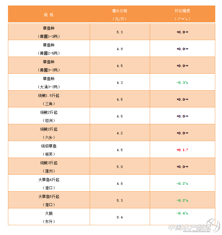 | 中國水產(chǎn)頻道原創(chuàng)報道, 文/ 珠海海龍、水產(chǎn)前沿 吳佳輝 草魚:大草魚流通速度慢,價格小幅下滑 草魚種和統(tǒng)鯇板塊,流通相對比較順暢,價格總體穩(wěn)定,波動不大。大草魚板塊,價格有了小幅度下滑,流通速度比較慢,魚價短期內難以上漲。脆肉鯇板塊,市場需求量不明顯,流通速度非常慢,價格持續(xù)下滑。 |