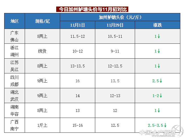 | 中國水產(chǎn)頻道原創(chuàng)報道, 養(yǎng)好魚,更要賣好魚! 加州鱸行情周報 《鱖鱸前沿》與您相約每周五 文/圖 鱖鱸前沿 李曉欣 轉(zhuǎn)眼已是11月的尾巴,本月以來,各產(chǎn)區(qū)加州鱸塘頭價全線下行,但整體來看跌幅相比上月已經(jīng)有所放緩,目前多地魚價呈止跌趨穩(wěn)態(tài)勢,行情比較穩(wěn)定。 目前廣東佛山8兩上報價10.5-11元/斤左右,已經(jīng)接近10元關(guān)口,不過價格比去年同期10-10.5元/斤仍高出0.5元/斤左右。其他產(chǎn)區(qū)塘頭價受廣東行情影響,魚價也有所下行,各地魚價差距縮小。近期天氣轉(zhuǎn)冷,加上魚價未達(dá)養(yǎng)戶心理價位,部分養(yǎng)戶惜售心理有所增強。 低溫時節(jié),雖然池塘問題沒有高溫期那么多,但存塘風(fēng)險仍在,例如轉(zhuǎn)季所引起的倒藻、返底現(xiàn)象及低溫期容易出現(xiàn)爛身、水霉病等病害,建議養(yǎng)戶加強魚塘管理及病害防護(hù)工作,降低養(yǎng)殖風(fēng)險,同時理性看待魚價走勢,合理安排出魚時機,確保養(yǎng)殖收益。 廣東佛山 今天佛山8兩上報價10.5-11元/斤左右,實際塘頭價根據(jù)魚頭大小和規(guī)格不同略有浮動。目前價位相比高位時落差較大,已經(jīng)出過第一、第二箍魚的養(yǎng)戶大多惜售,想養(yǎng)大規(guī)格魚提高產(chǎn)量和效益。選擇出魚的養(yǎng)戶都傾向出大規(guī)格魚,本周出8兩上和1斤上規(guī)格的有所增多。 浙江湖州 湖州統(tǒng)貨報價9-11元/斤左右,魚價一周持穩(wěn),具體價格看炮頭大小和規(guī)格成次而定,以出統(tǒng)貨為主。湖州本地養(yǎng)戶出魚積極性較高,加上魚價便宜,吸引了不少流通商過來收魚。 江蘇吳江 吳江魚價一周下跌了0.5元/斤,目前8兩上報價12-12.5元/斤左右,由于價格未達(dá)養(yǎng)戶心理預(yù)期,加上當(dāng)?shù)亓?xí)慣養(yǎng)老口,大部分養(yǎng)戶都在觀望,目前出魚量不大,流通商多到湖州區(qū)域收魚。 四川成都 今天報價9兩上13.5元/斤左右,魚價相比上周跌了0.5元/斤,主要是受廣東鱸魚行情影響。氣溫變冷后,本周出魚量相比上周有所減少。 湖北武漢 武漢鱸魚價格一周持穩(wěn),9兩上報價12-13元/斤左右,本地新魚上市量不大,主要是目前價格未達(dá)養(yǎng)戶心理價位,流通商多到廣東和浙江區(qū)域收魚。 湖南華容 本周華容8兩上鱸魚維持在12元/斤左右,目前價格持穩(wěn)了20多天。華容本地達(dá)上市規(guī)格的存魚不多,加上魚價未達(dá)預(yù)期,養(yǎng)戶賣魚積極性不高,當(dāng)?shù)佤~中多到周邊區(qū)域收魚。 廣西南寧 本周南寧魚價持穩(wěn),1斤上報價12.5元/斤左右,部分養(yǎng)戶想趕在越冬前出魚,以減少損耗,出魚量略有增加,但總體走量不大。 |