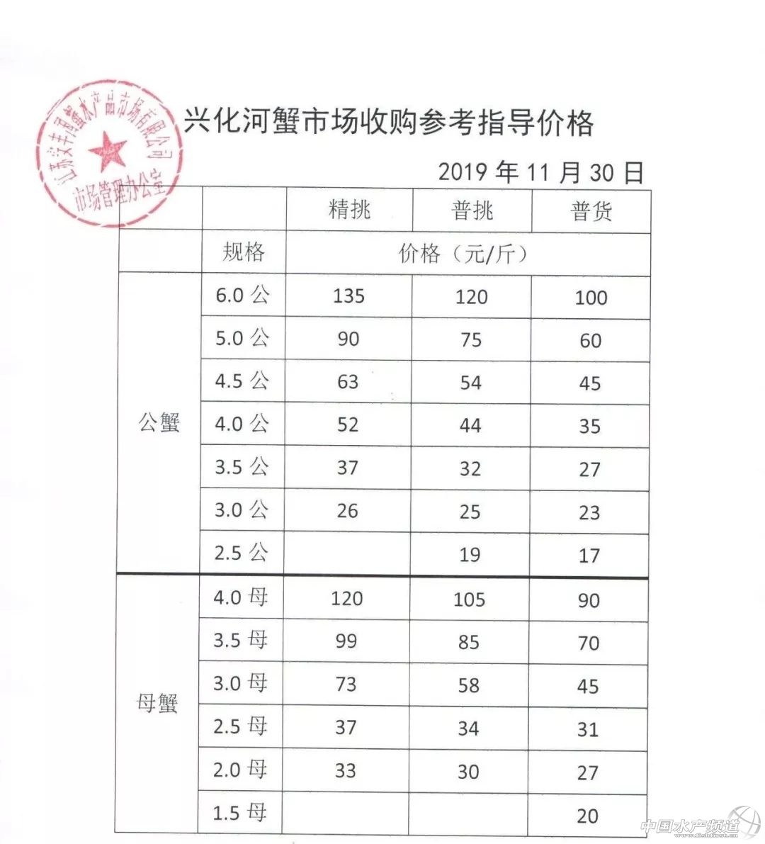 | 中國水產(chǎn)頻道原創(chuàng)報道, 最新河蟹行情解析 高淳 近期高淳精品蟹價整體先漲后跌,繼昨天小幅下跌后,今天蟹價保持平穩(wěn)。與去年同期相比,目前蟹價仍舊偏低。 今天高淳精品門市各規(guī)格蟹價基本未變。 興化 近期興化精挑蟹價呈上漲趨勢,今天繼續(xù)小幅上漲,其中6公漲5元/斤,5公、4公均漲2元/斤,3.5公漲1元/斤,其他規(guī)格蟹價基本未變。 同時,今天興化市場指導(dǎo)價普挑價格略有上漲,普貨價格則保持平穩(wěn)。 今日河蟹參考價 興化 此報價由江蘇安豐國蟹水產(chǎn)品市場提供 此報價由江蘇好潤馬家蕩店宋利坤提供 高淳 泗洪 此報價由泗洪孫老板提供 無錫 此報價由無錫王老板提供 宣城 此報價由宣城劉老板提供 上海 此報價由上海曹老板提供 湖州 此報價由江蘇好潤漾西店井振提供 |