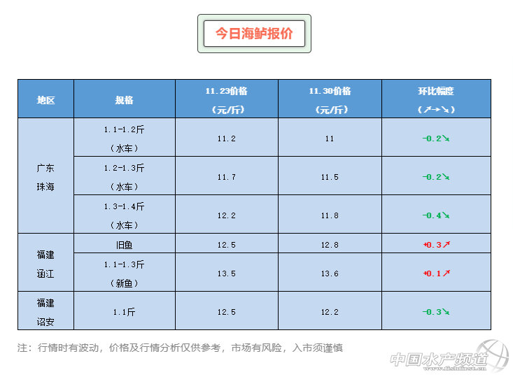 | 中國水產(chǎn)頻道原創(chuàng)報(bào)道, 供求平衡,珠海海鱸價(jià)格持穩(wěn) 文/ 水產(chǎn)前沿 陳曉慶 全新的海鱸行情周報(bào)正式開啟,每周與您相約,歡迎各位讀者交流看法與建議,提供更多地區(qū)價(jià)格行情,讓信息更暢通,讓每個(gè)人都能養(yǎng)好魚、賣好魚! 一周行情簡析 珠海海鱸:本周珠海海鱸價(jià)格有所下滑,新魚1.1-1.2斤報(bào)價(jià)11元/斤,1.2-1.3斤報(bào)價(jià)11.5元/斤,相比上周下降了0.2元/斤;1.3-1.4斤報(bào)價(jià)11.8元/斤,相比上周下降了0.4元/斤。目前頭批魚出魚已經(jīng)到了尾聲,中批魚準(zhǔn)備上市,市場供求關(guān)系相對穩(wěn)定,養(yǎng)殖戶不用排隊(duì)出魚,魚中也沒有出現(xiàn)搶魚的情況。業(yè)內(nèi)人士表示,中批魚大量上市還需等到十二月中旬之后,當(dāng)前行情還是以持穩(wěn)為主。 本周二,珠海市大粵農(nóng)水產(chǎn)科技有限公司日前第一批抵達(dá)珠海白蕉鎮(zhèn)的海鱸幼苗(規(guī)格1.2-1.5公分左右)出苗,整體成活率高達(dá)90%,整體規(guī)格達(dá)2.6-3公分,這標(biāo)志著白蕉海鱸魚苗珠海本地規(guī);a(chǎn)性培育標(biāo)粗的成功! 本次大粵農(nóng)公司率先嘗試規(guī);a(chǎn)性培育標(biāo)粗并獲得成功為白蕉海鱸養(yǎng)殖者們提供了多一份選擇。目前第一批200萬海鱸苗基本達(dá)到2.6-3公分就已經(jīng)被經(jīng)銷商和養(yǎng)殖戶預(yù)訂一空,后續(xù)按照該公司的規(guī)劃到2020年5月份,總體標(biāo)粗?jǐn)?shù)量會達(dá)4000萬尾或以上,預(yù)計(jì)約占整個(gè)市場的1/10(市場預(yù)期2020年海鱸投苗量最少4億尾)。 海鱸魚苗產(chǎn)業(yè)長期以來主要以“浙江江蘇或福建產(chǎn)卵+福建漳浦孵化+福建詔安標(biāo)粗”模式運(yùn)作。目前珠海本地培育標(biāo)粗的海鱸苗正處于試驗(yàn)階段,200萬海鱸苗自然未能滿足珠海所有搏頭批養(yǎng)殖戶的需求,頭批苗依然還是以福建苗為主。目前福建海鱸苗價(jià)格2公分半價(jià)格在3毛2左右,由于今年標(biāo)粗場收苗的價(jià)格比往年還要高一倍左右,所以價(jià)格相對要高一些。 另外,今年廣東陽江地區(qū)對海鱸苗價(jià)格變化也是一個(gè)很重要的影響因素,往年陽江魚蛋孵化的氣溫一般到過年前后才能達(dá)到,但2019年的苗價(jià)好行情令部分業(yè)者整體將放魚蛋的時(shí)間冒險(xiǎn)提前,按照目前的進(jìn)度還是比較順利,當(dāng)前存塘1.2-1.8公分規(guī)格的小苗約600萬,后續(xù)仍會繼續(xù)放卵孵化。(部分內(nèi)容參考自斗門養(yǎng)殖) 今年早批苗有養(yǎng)殖戶反饋部分苗出現(xiàn)黑身的問題,部分養(yǎng)殖戶因此選擇等下一批苗,也有人看好行情大膽選擇搏一搏。你的選擇呢? 福建海鱸:本周涵江鱸魚價(jià)格止跌回漲,詔安鱸魚有所下滑。涵江鱸魚1.1-1.3斤規(guī)格報(bào)價(jià)13.6元/斤,老鱸12.8元/斤,相比上周上漲了0.1-0.3元/斤;詔安鱸魚12.2元/斤,相比上周下降了0.3元/斤。 |
