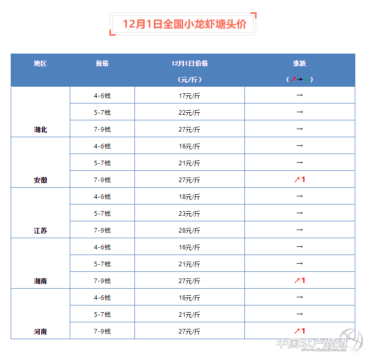 摘要: 中國水產(chǎn)頻道報道,12月1日全國小龍蝦塘頭價 。