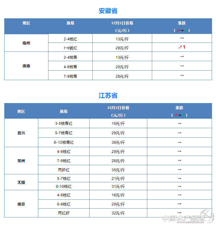 摘要: 中國(guó)水產(chǎn)頻道報(bào)道, 12月1日全國(guó)小龍蝦市場(chǎng)批發(fā)價(jià)。