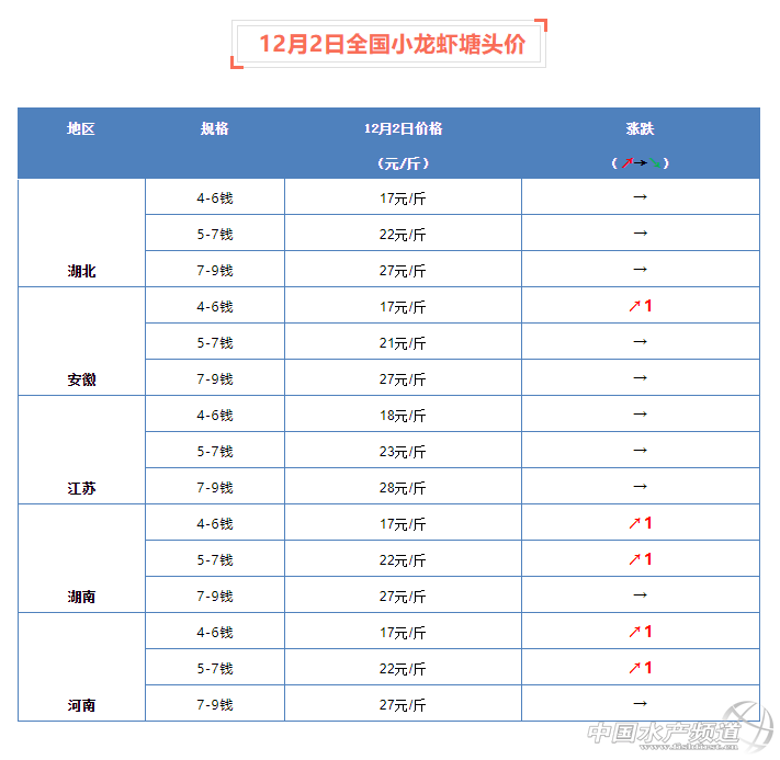 摘要: 中國水產(chǎn)頻道報道,12月2日全國小龍蝦塘頭價 。